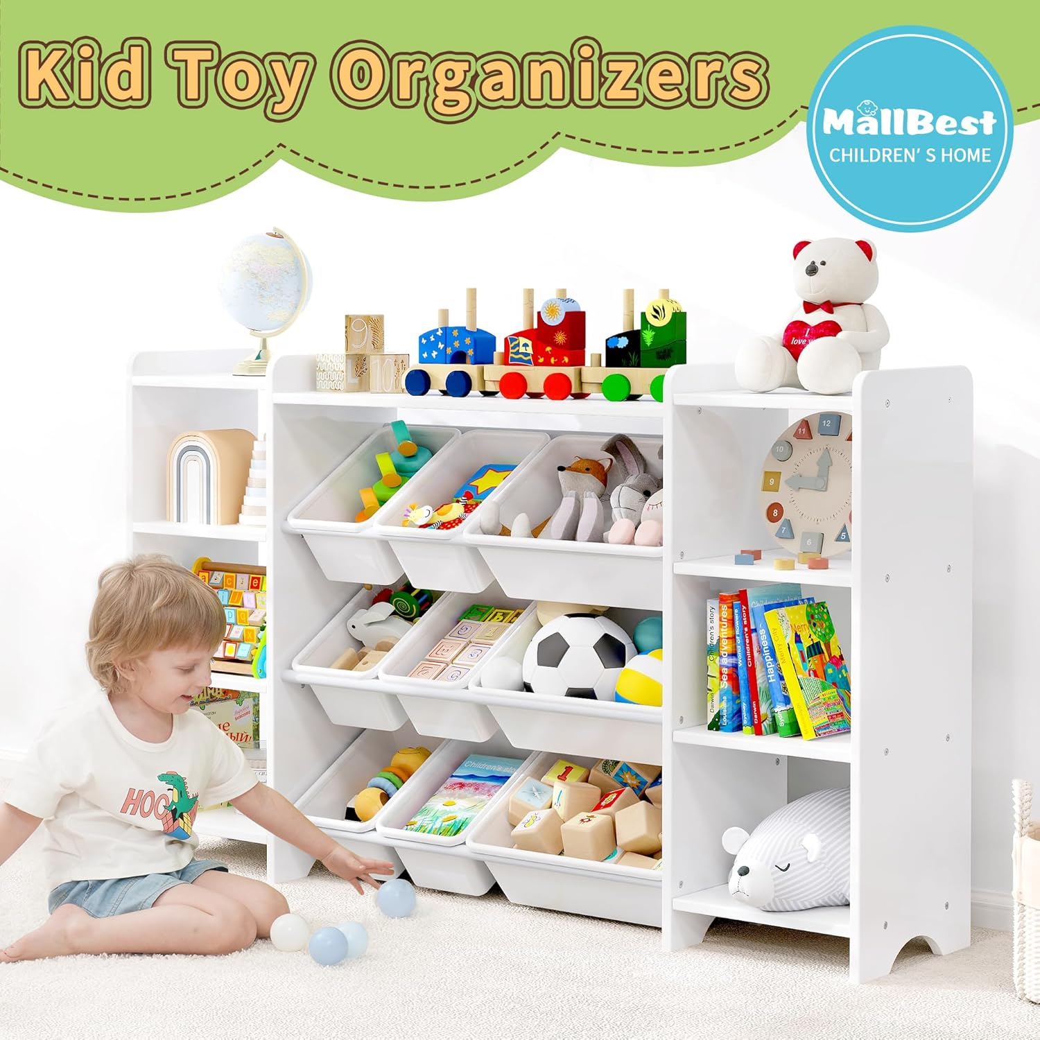 MallBest 4-Tier Kids' Toy Storage Organizer Shelf - 100% Solid Wood, Children's Organizer Cabinet with 9 Plastic Bins and 6 Storage Ports (White)