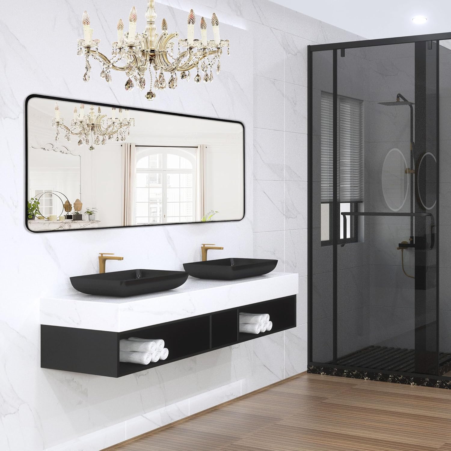 - Versatile Convenience: Our black metal mirror adapts seamlessly to various spaces, from the bathroom to the bedroom, living room, dining room, entrance, and even fireplace. From hotels to hair salons. From household to commercial. You can use it with confidence. It serves as both a practical vanity mirror and a chic decorative accent
