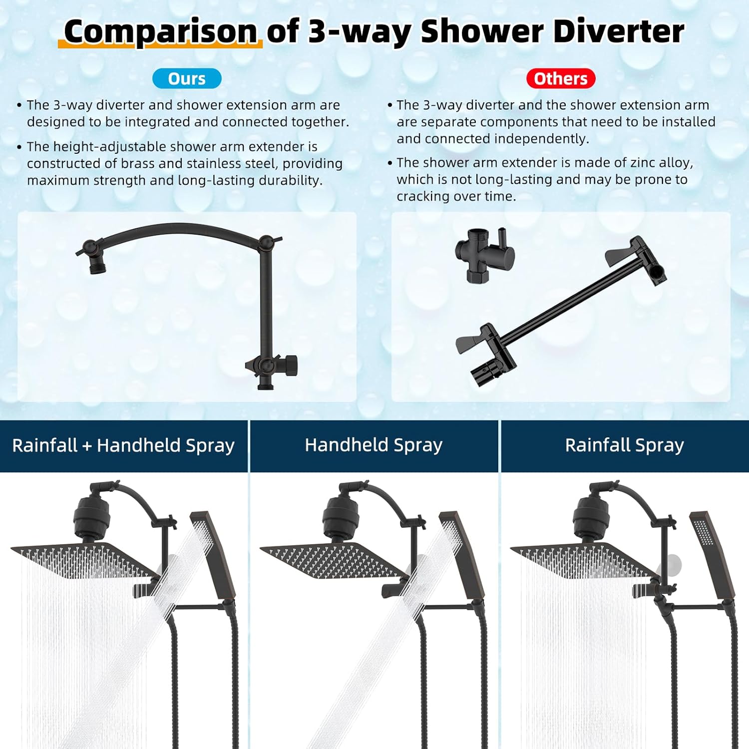 - [Upgraded 3-Way Diverter Valve] Experience hassle-free installation with this shower head combo, requiring no tools or plumbers. The 3-way diverter offers the flexibility to use either a shower head or rainfall shower head alone, or both simultaneously. Our diverter and shower extension arm is designed to be connected without leaking and shaking, while an ordinary 3-way diverter is separated from the extension arm, and it needs to be installed and connected, which will lead to a leak and shake.