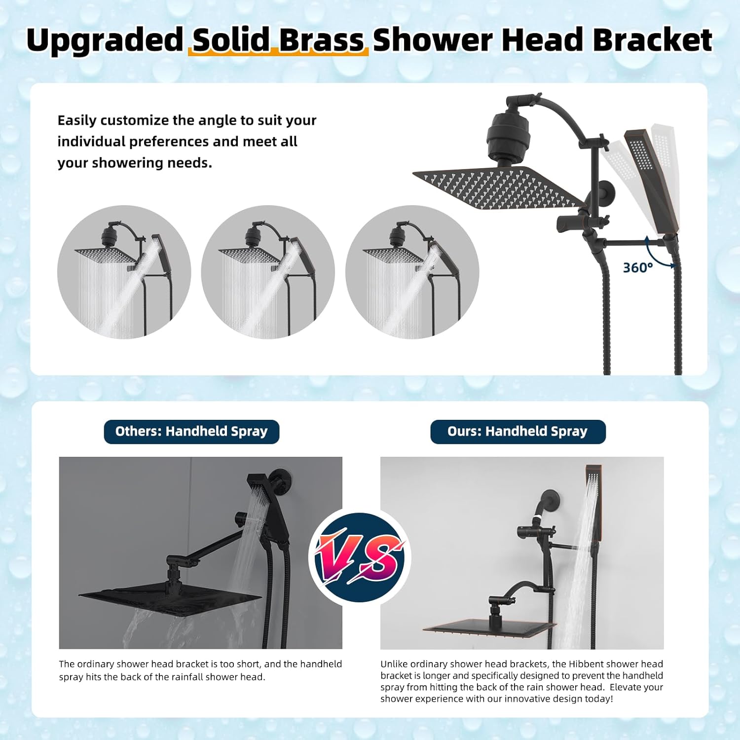 - [Metal Shower Head & Bracket] Distinguished by its elongated design, the Hibbent bracket sets itself apart from common shower head brackets by preventing any collision between the handheld spray and the rain shower head. Others shower head comes with shorter brackets, and the handheld spray will hit the back of the rain shower head. Crafted from stainless steel and brass to combat corrosion, both the shower head and bracket exemplify durability and long-lasting quality.