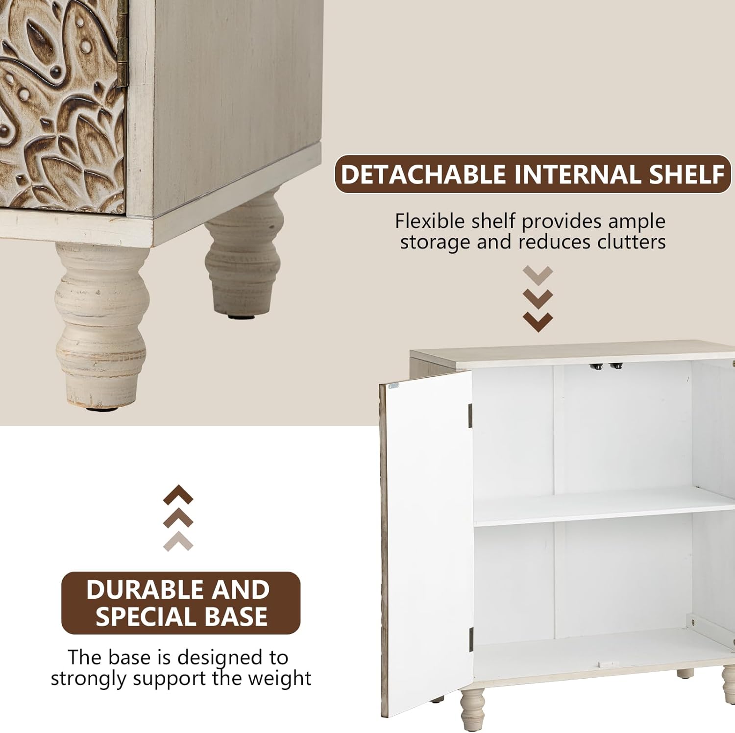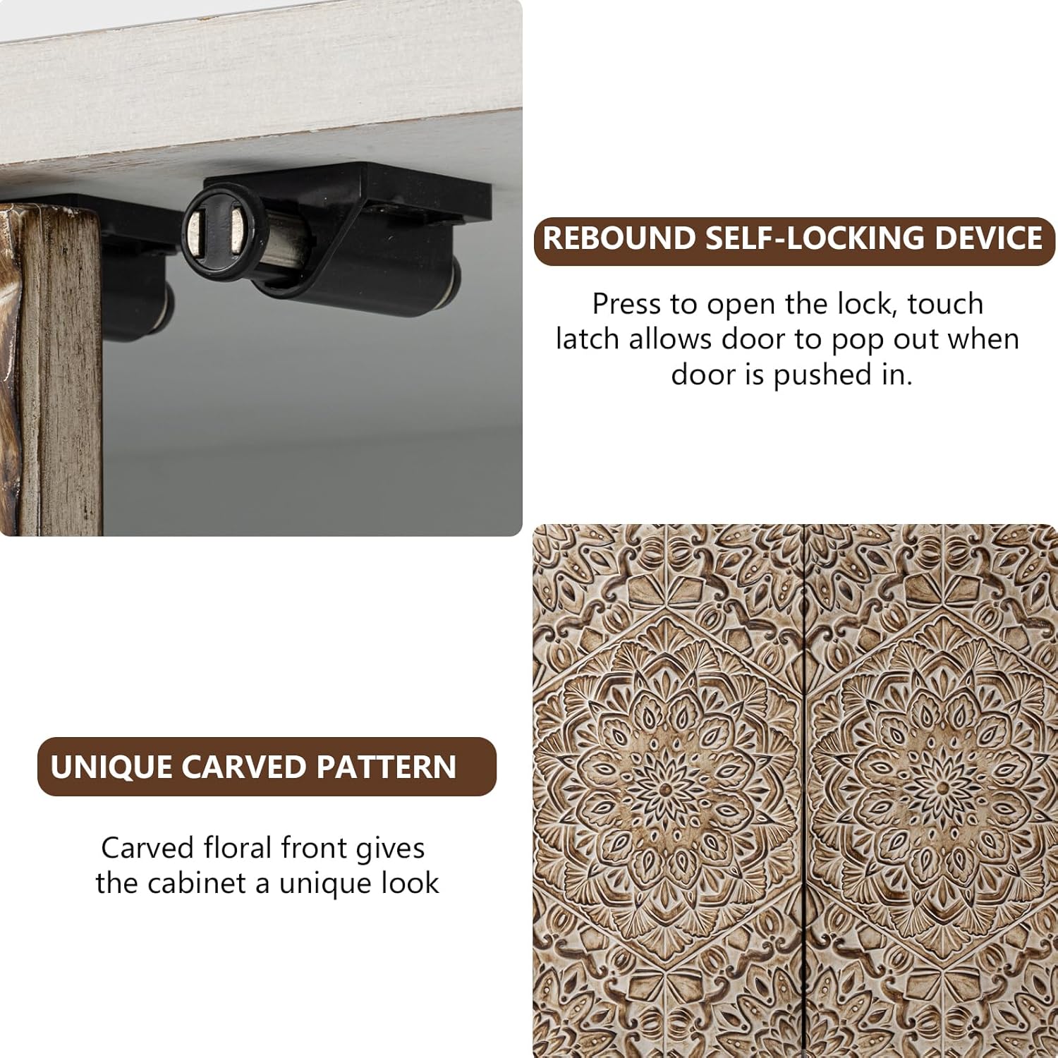 - Quality Material: Made of high-quality MDF material, it's sturdy enough to weather any elements, which assures quality and long-lasting service. The floral carvings(Dark brown) on the solid pine doors emphasize the artistic touch. This is a vintage approach to the design, which adds more value to it, as crafting older designs gets more credit in this era. The floor cabinet is also equipped with an anti-tipping strap that can be fixed to the wall for safety.