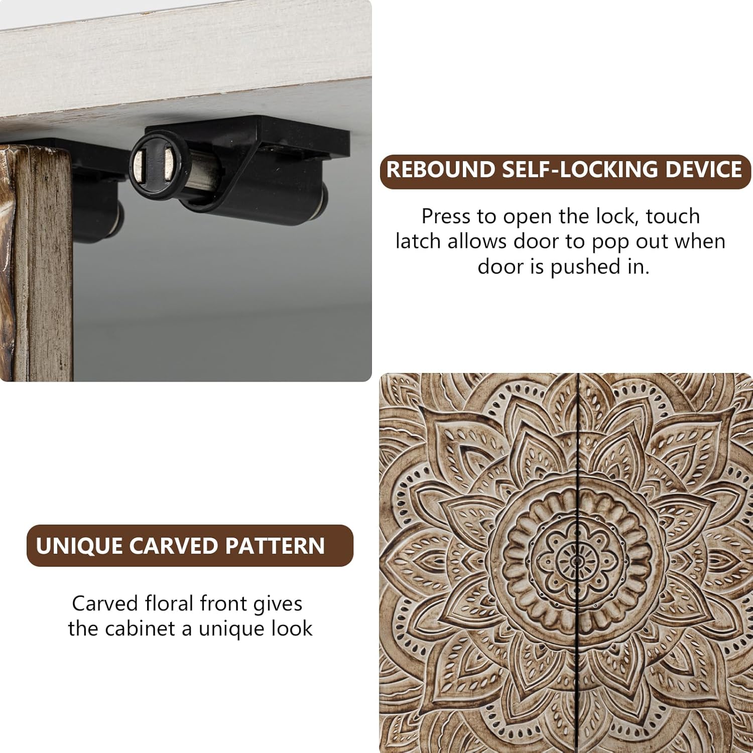 - Quality Material: Made of high-quality MDF material, it's sturdy enough to weather any elements, which assures quality and long-lasting service. The floral carvings(Dark brown) on the solid pine doors emphasize the artistic touch. This is a vintage approach to the design, which adds more value to it, as crafting older designs gets more credit in this era. The floor cabinet is also equipped with an anti-tipping strap that can be fixed to the wall for safety.