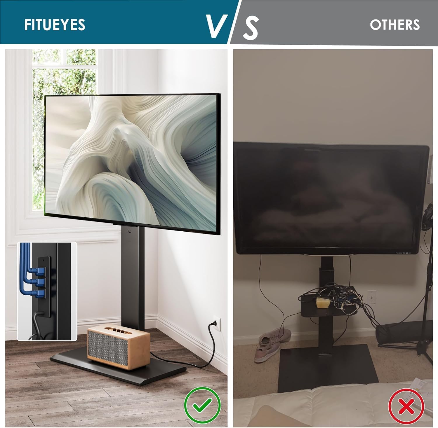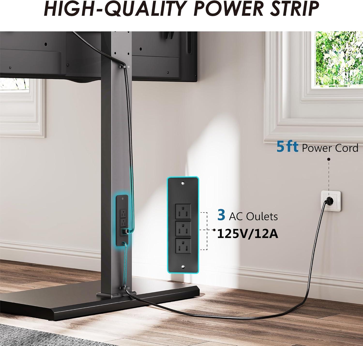 - Power Strip & Cable Management: FITUEYES floor TV stand is equipped with a power strip on the back with 3 AC outlets (125V/12A). No need to worry about the short wires. Careful cable management avoids the risk of tangled cables