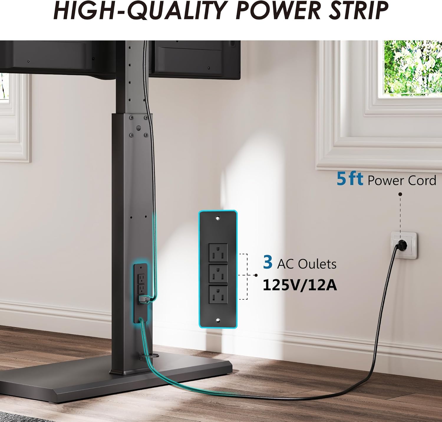 - RoHS Compliant: FITUEYES floor TV stand is equipped with a power strip on the back with 3 AC outlets (125V/12A), it complies with RoHS material and process standards for electronic products, which is more conducive to human health and environmental protection