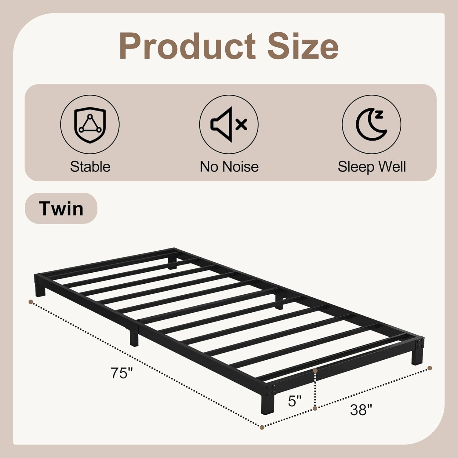 5 Inch Low Bed Frame Twin, Heavy Duty Twin Bed Frames Low Profile, No Box Spring Needed, Easy Assembly, Noise Free, Black