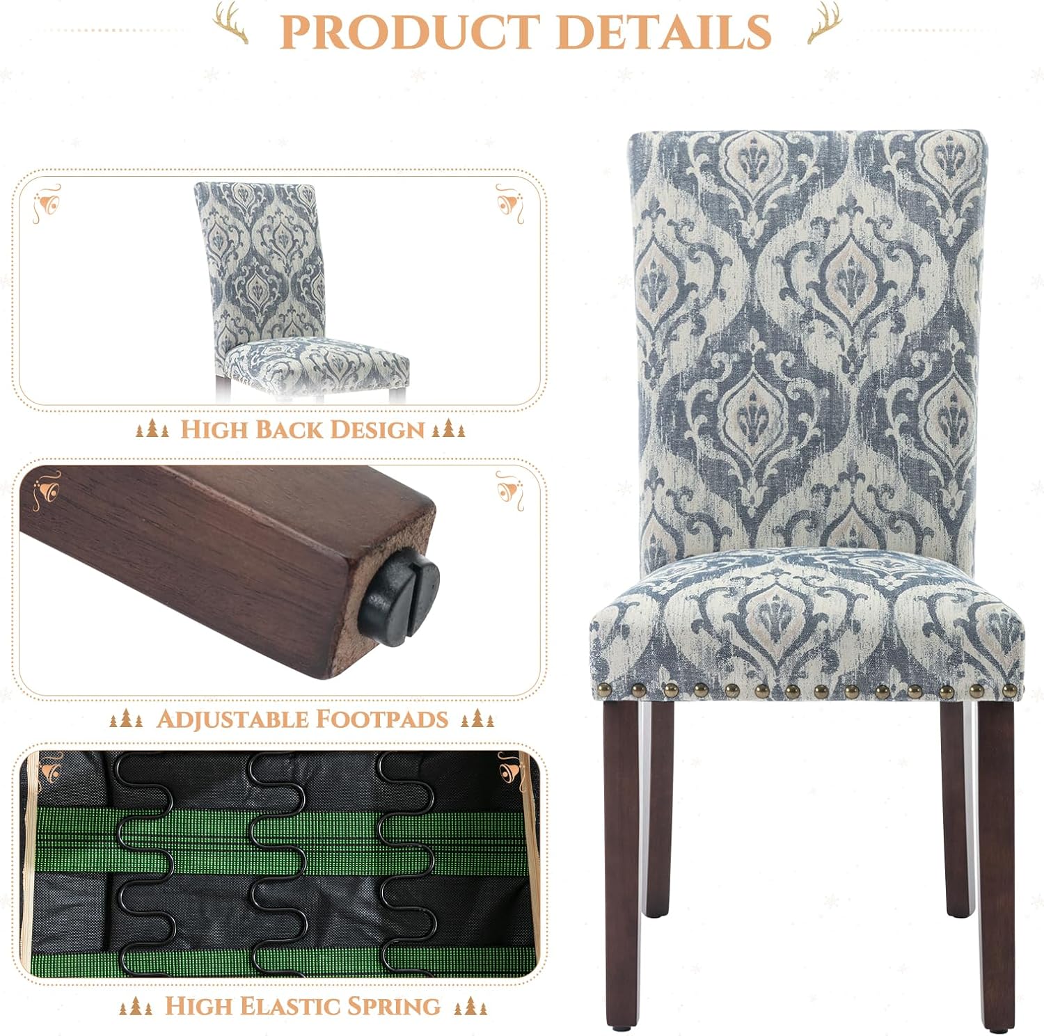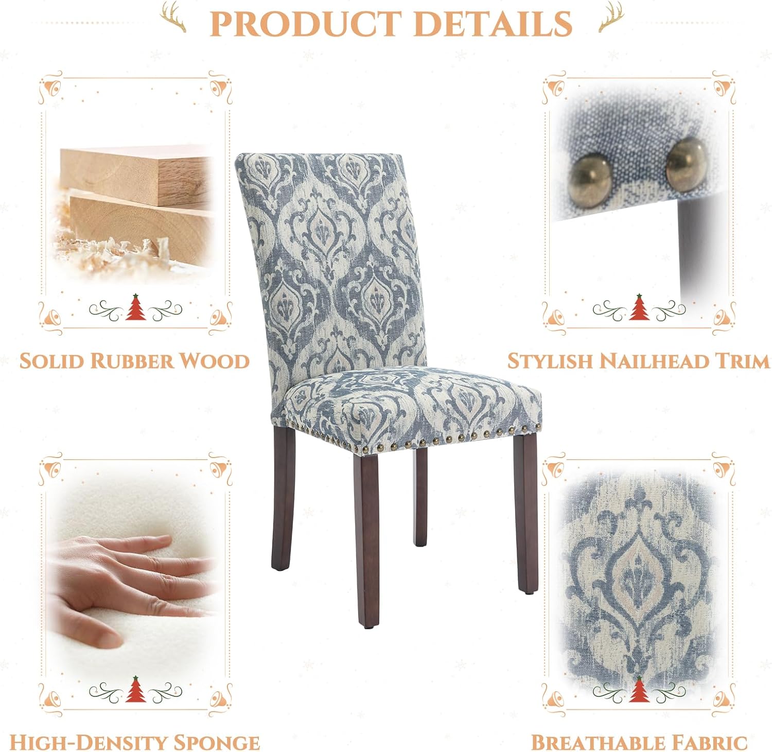 Parsons Dining Chairs Set of 2, Upholstered Nailhead Dining Room Kitchen Side Chair with Thick Cushions and Wood Legs, White/Blue
