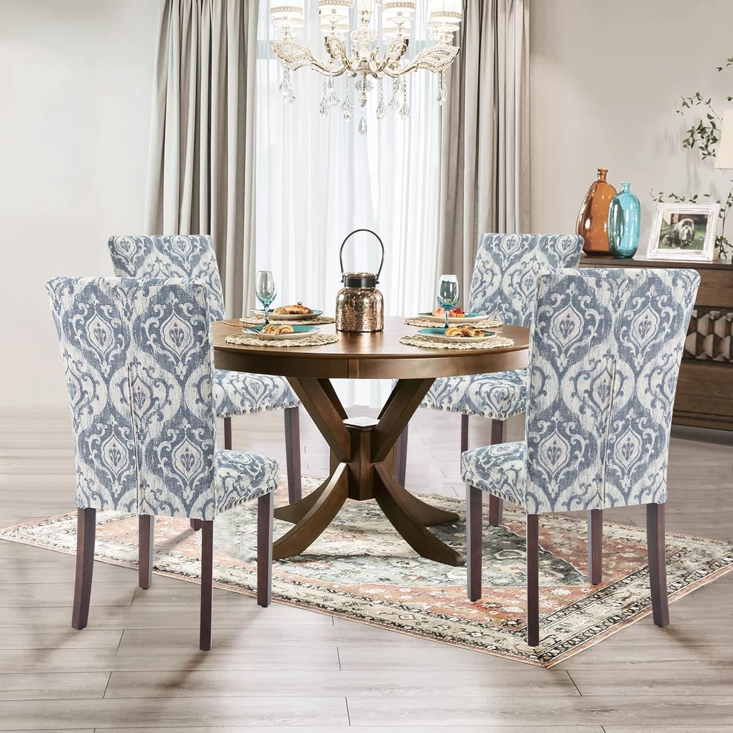 Parsons Dining Chairs Set of 4, Upholstered Nailhead Dining Room Kitchen Side Chair with Thick Cushions and Wood Legs, White/Blue