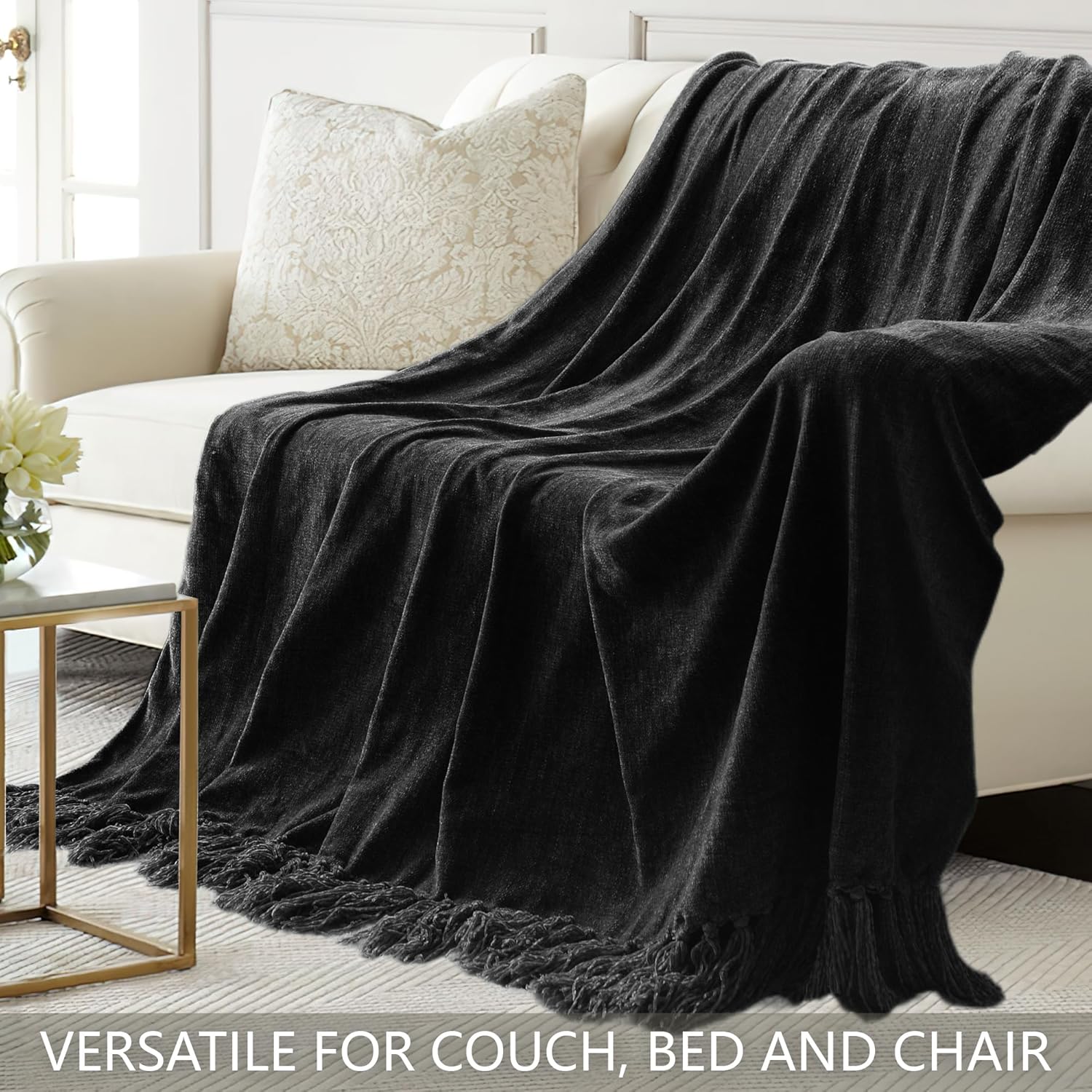 Chenille Throw Blanket for Couch 60"X 80" Twin, Soft Cozy Throws with Fringe Tassel for Bed Sofa Chair Cover, Lightweight Knitted Decorative Boho Blankets for Living Room, Black