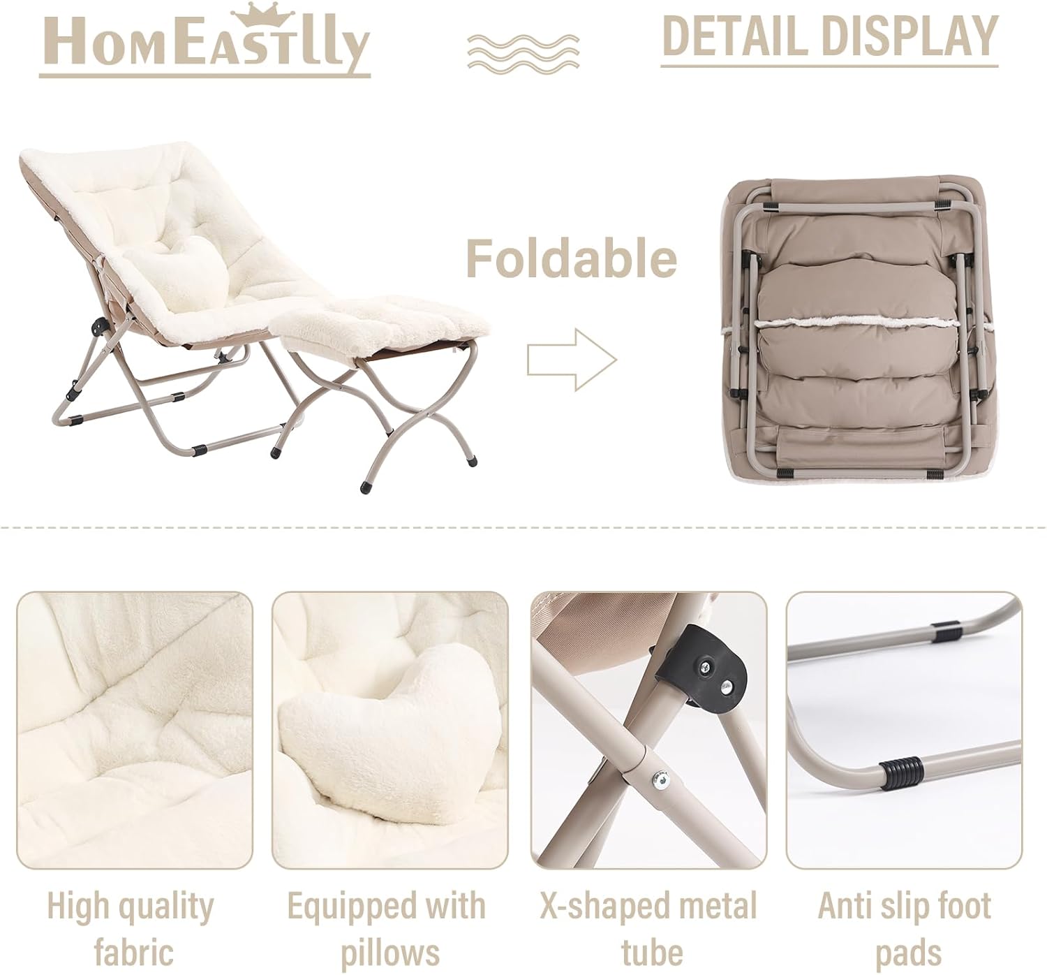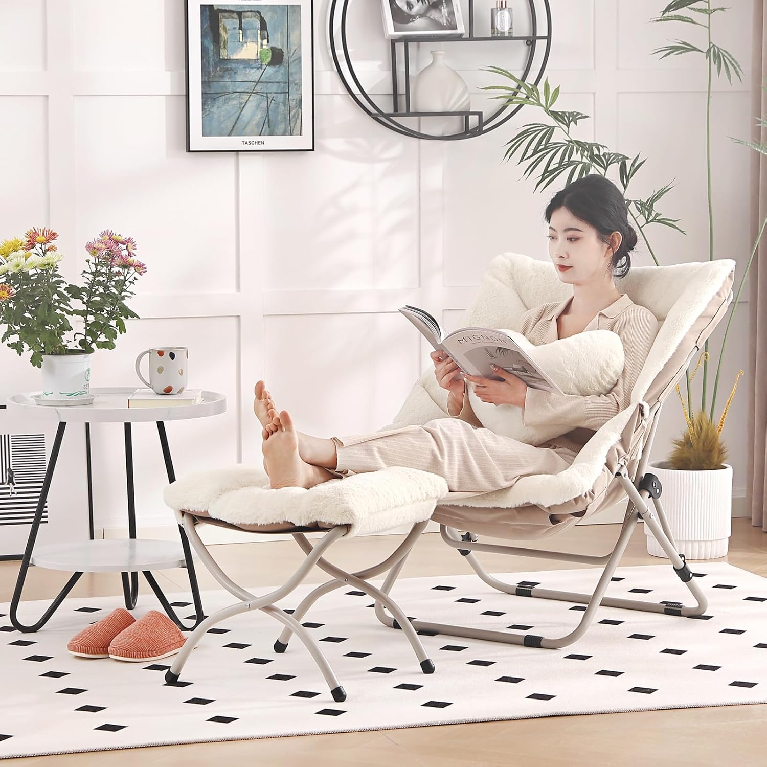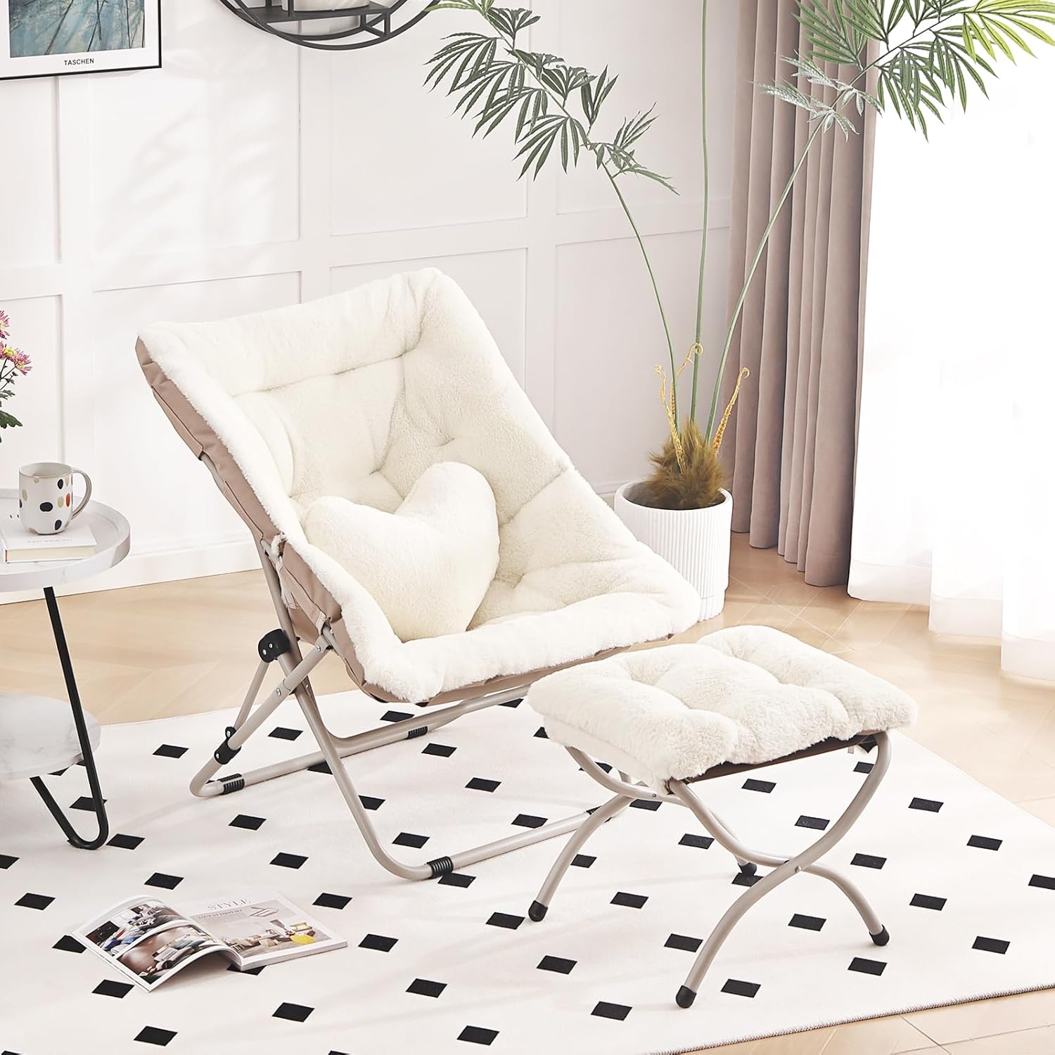 Saucer Chair with Ottoman, Comfy Oversized Folding Chair, Faux-Fur Reading Chair for Adults, Foldable Accent Lazy Chair, Metal Frame Lounge Chair for Living Room, Bedroom, Beige