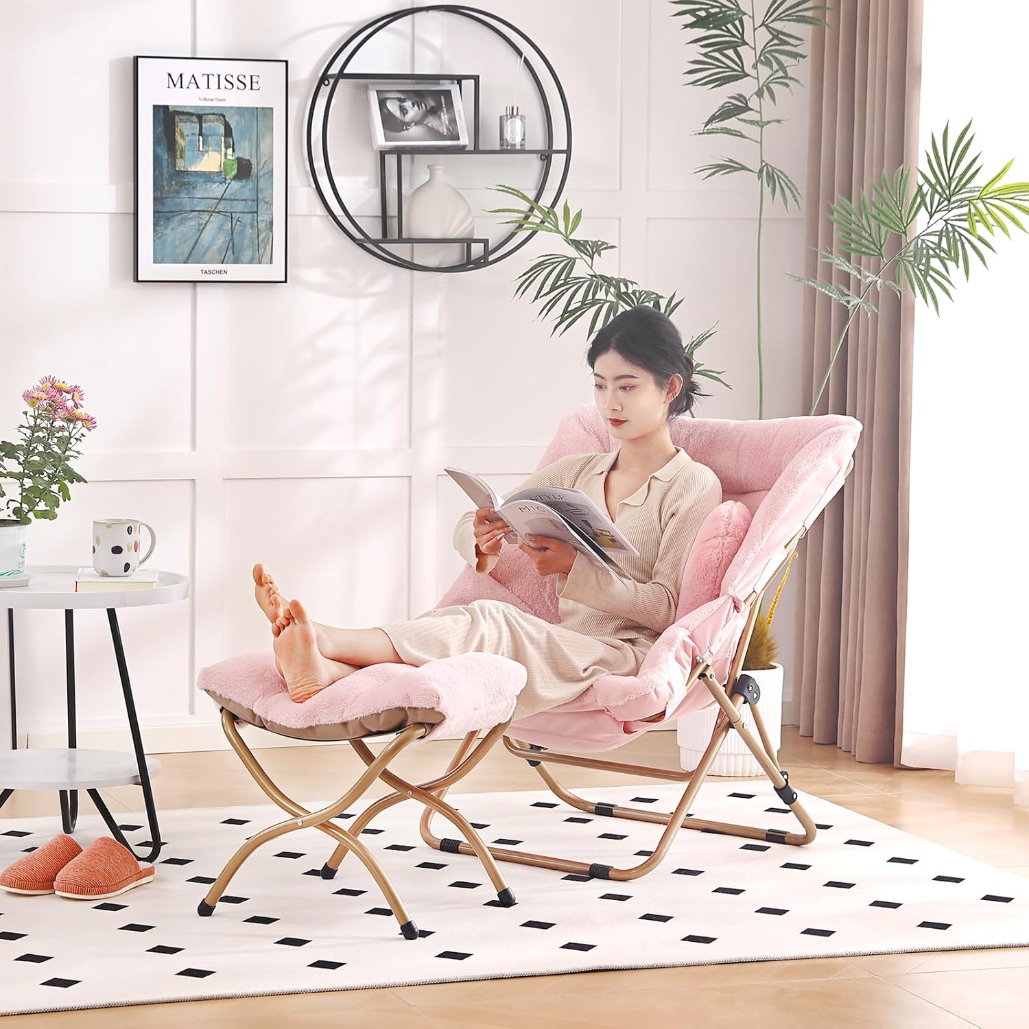- [Sturdy & High-Quality Seating] Oversized Folding Faux Fur Chair is made of thickened Q195 carbon structural steel, and can support up to 250 lbs. Our chic saucer chair is designed with a triangular structure, which strengthens the structural support and makes it more stable and reliable than other X-shaped structures, while also scientifically distributing the stress points so that the frame is less likely to break and more durable.
