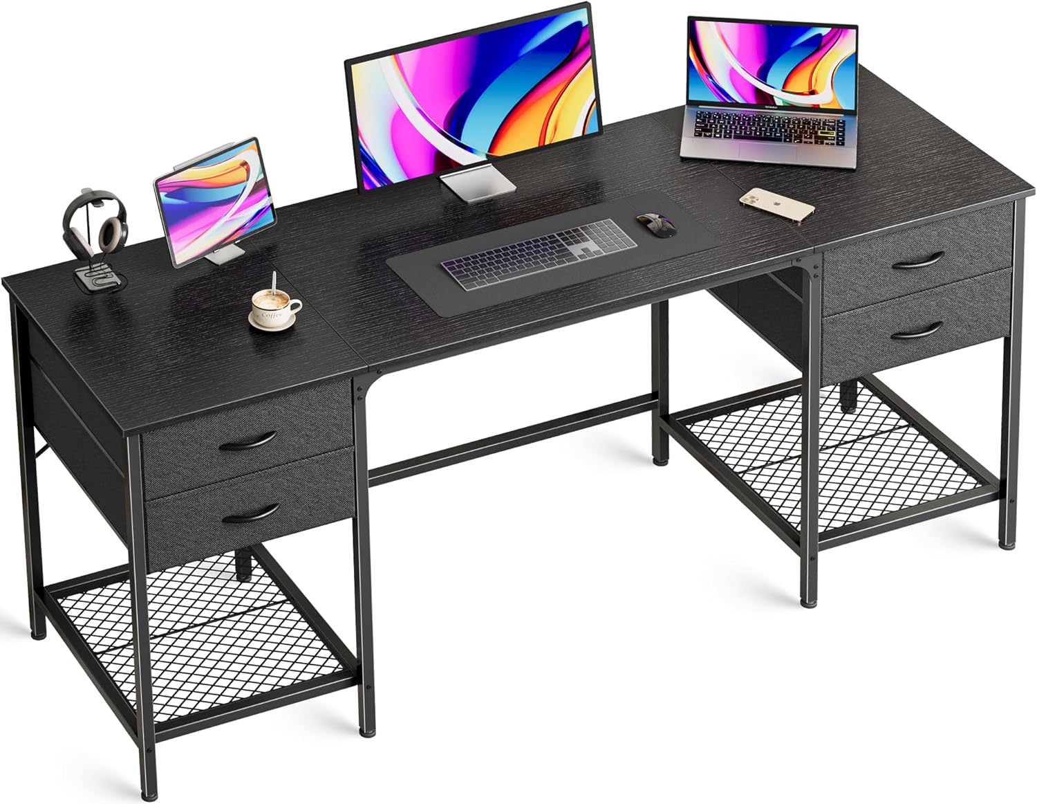 Huuger 63 Inch Computer Desk with 4 Drawers, Mesh Shelf, Gaming, Large Storage, Writing Work Desk for Home, Study, Bedroom, Work from Home, Black