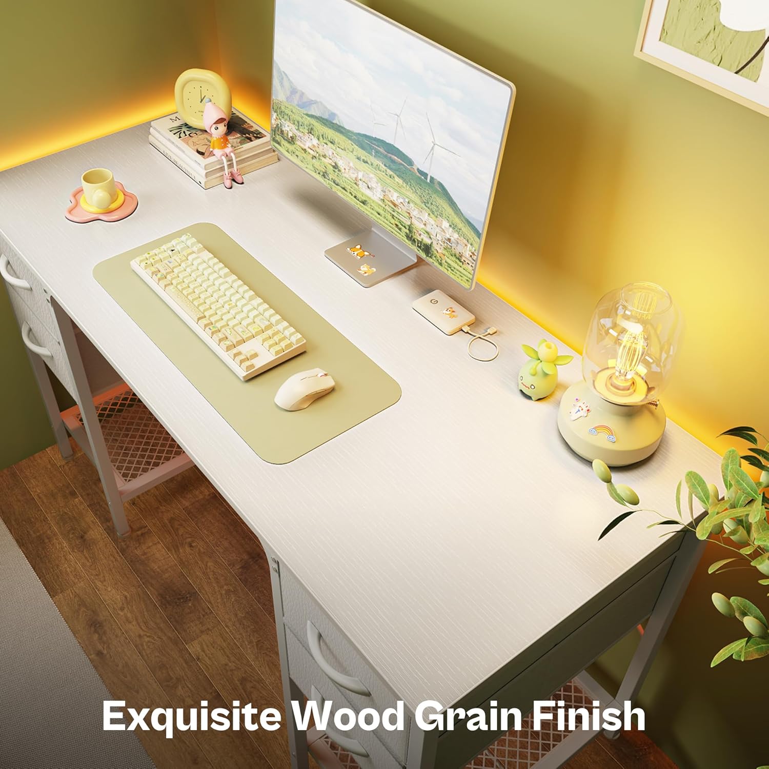 - 【Solid Construction】Rest easy knowing your vanity desk with drawers is built to last. Featuring a sturdy metal frame, durable particleboard, and 4 fabric dresser, this computer desk supports all your essentials with ease. The adjustable feet ensure stability on any floor surface, making it a reliable choice for your daily activities