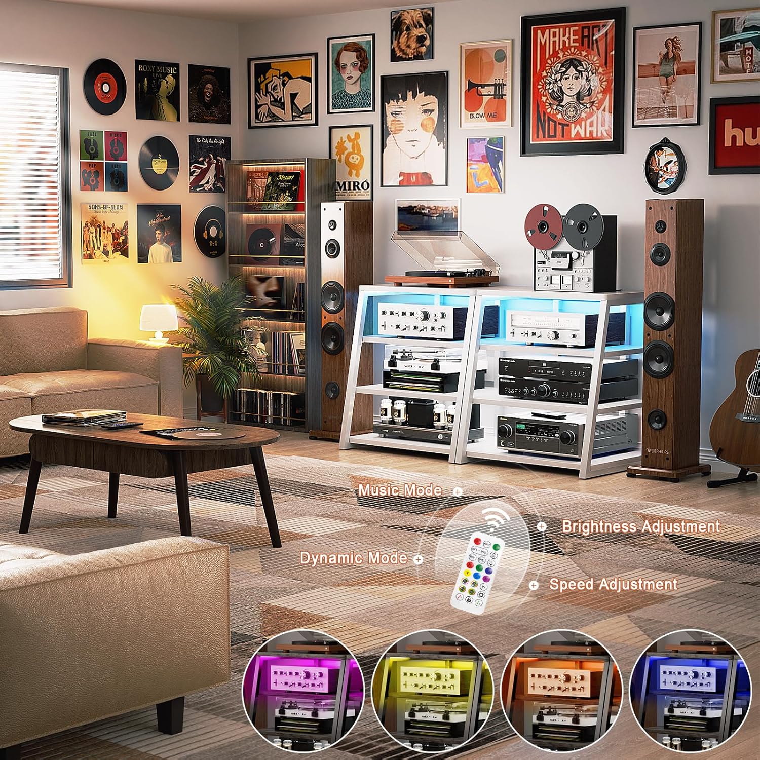 - Built-in Power Strips & LED Lights - Built in a power station including 4 receptacles plus 2 USBs, this AV media stand will make the charging of your electronics more convenient. It will save you space for adding power strips. The lighting is good for the mood setting. Static mode and 20 dynamic modes are flexible options for your music, gaming, and movie vibes.