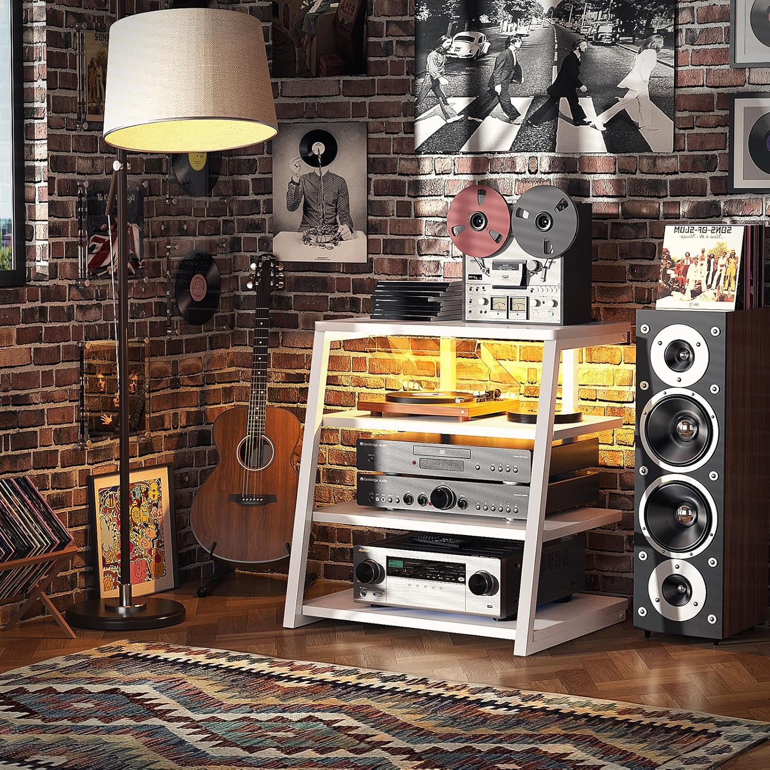 Armocity 4-Tier AV Media Stand with Power Strips, Stereo Stand with LED Lights, Audio Tower Rack with Adjustable Shelves, Small Entertainment Center, 30'', White
