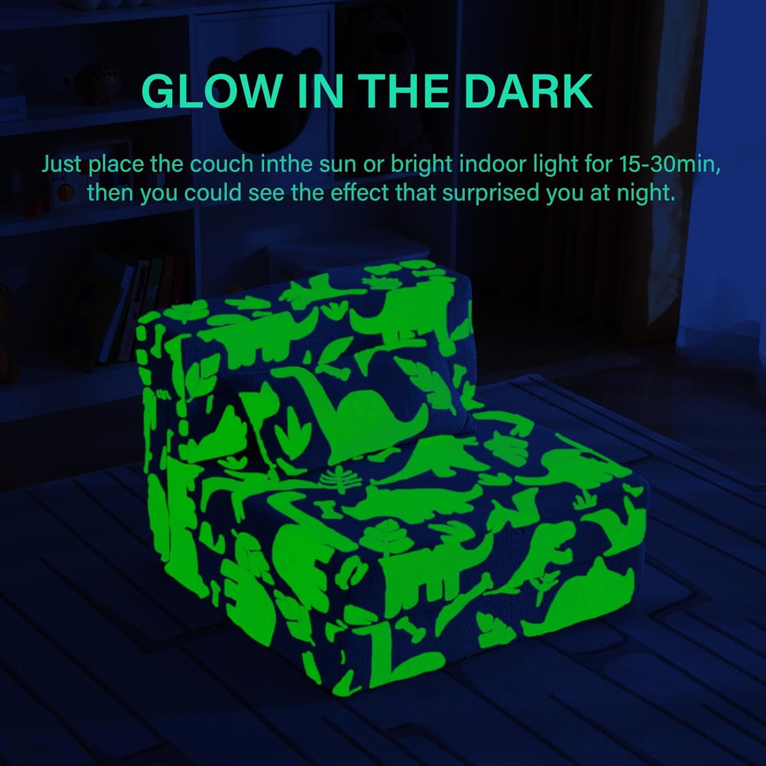 - 【Toddler Folding Sofa Bed Glow in The Dark】Unique luminous design. With exciting themes to choose from, including star, green dinosaur, rainbow, pink moon, and blue dinosaur. Simply place the toddler sofa under a bright light or sunlight for 10-15 minutes and bring it to a dark room to see the magic glow. The brighter the light shines, the stronger it glows in the dark.