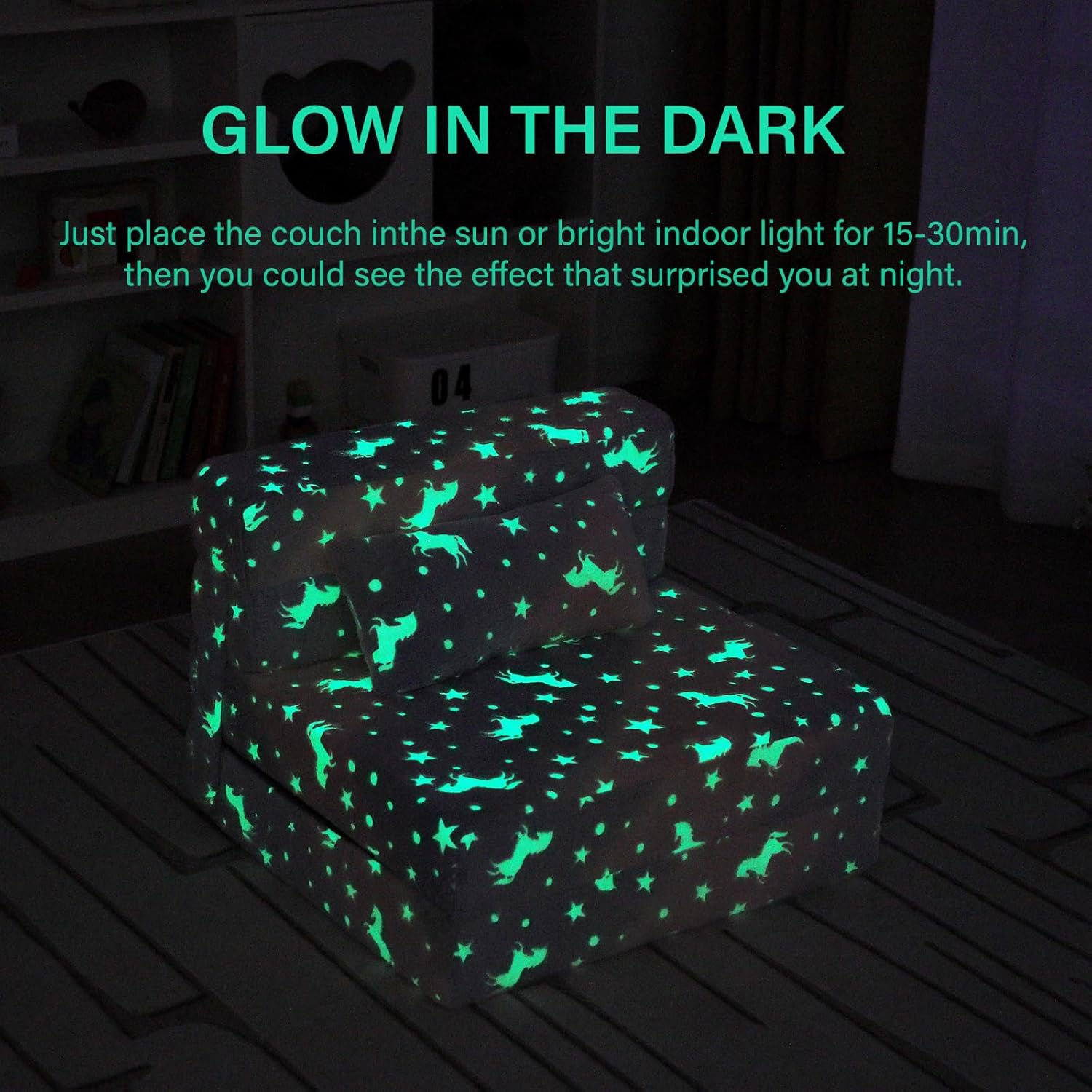 - 【Toddler Folding Sofa Bed Glow in The Dark】Unique luminous design. With exciting themes to choose from, including star, green dinosaur, rainbow, pink moon, and blue dinosaur. Simply place the toddler sofa under a bright light or sunlight for 10-15 minutes and bring it to a dark room to see the magic glow. The brighter the light shines, the stronger it glows in the dark.