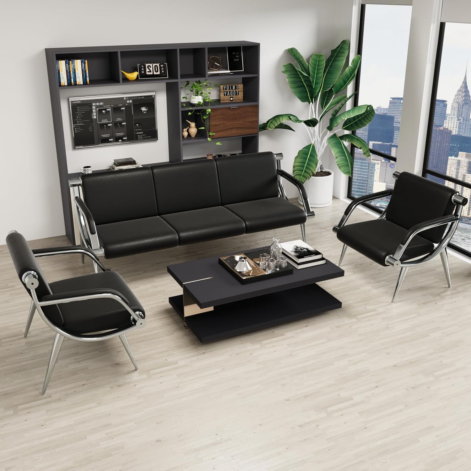 wonline 4 Seat Waiting Room Chair with Armrest PU Leather Office Furniture, Office Guest Seating Lobby Conference Reception Chairs for Airport Clinic Hospital Bank Salon Barber(Black)