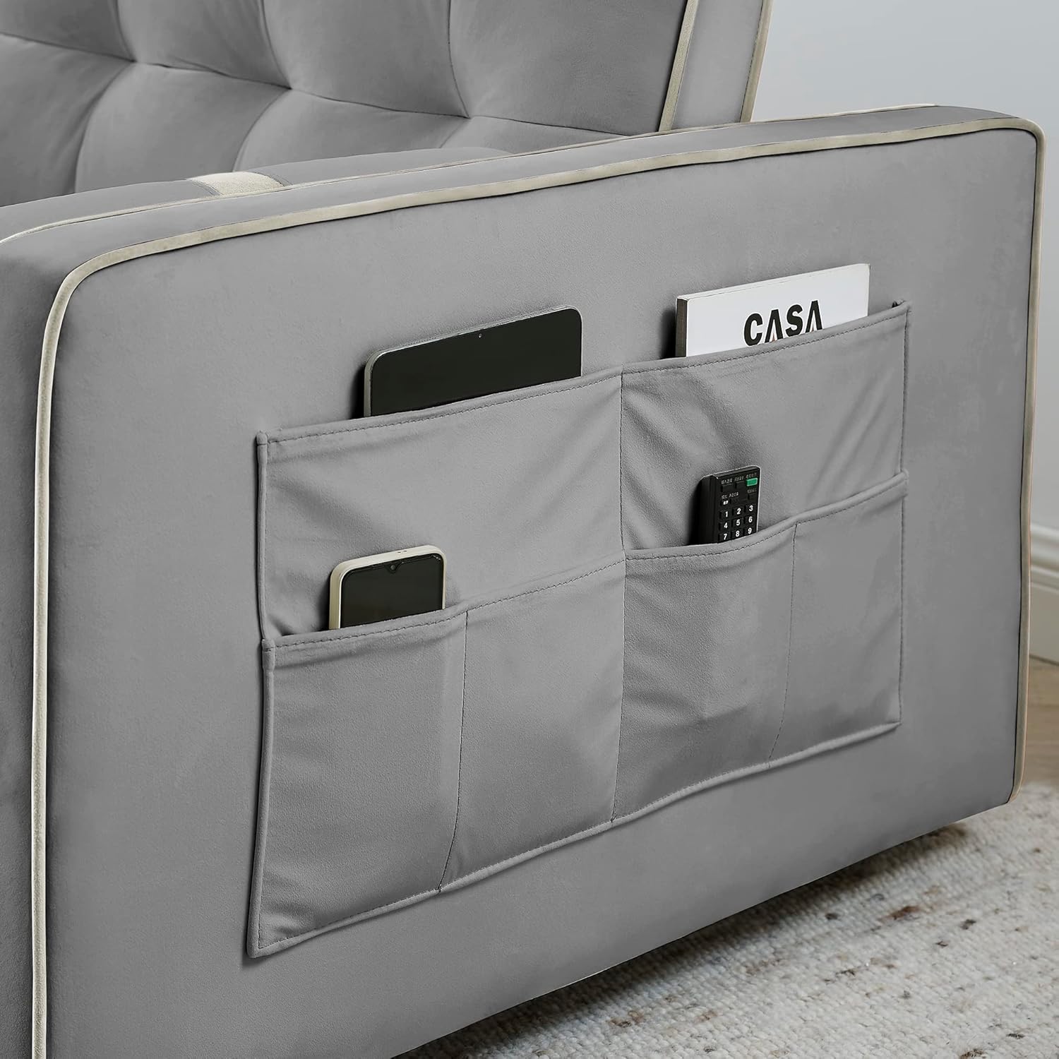 - 5. storage pockets and soft pillows. Our sofa comes with two side storage bag for you to reach and use to store your TV remote, cell phone, glasses or books. Also includes two soft pillows for added back support or sleep.