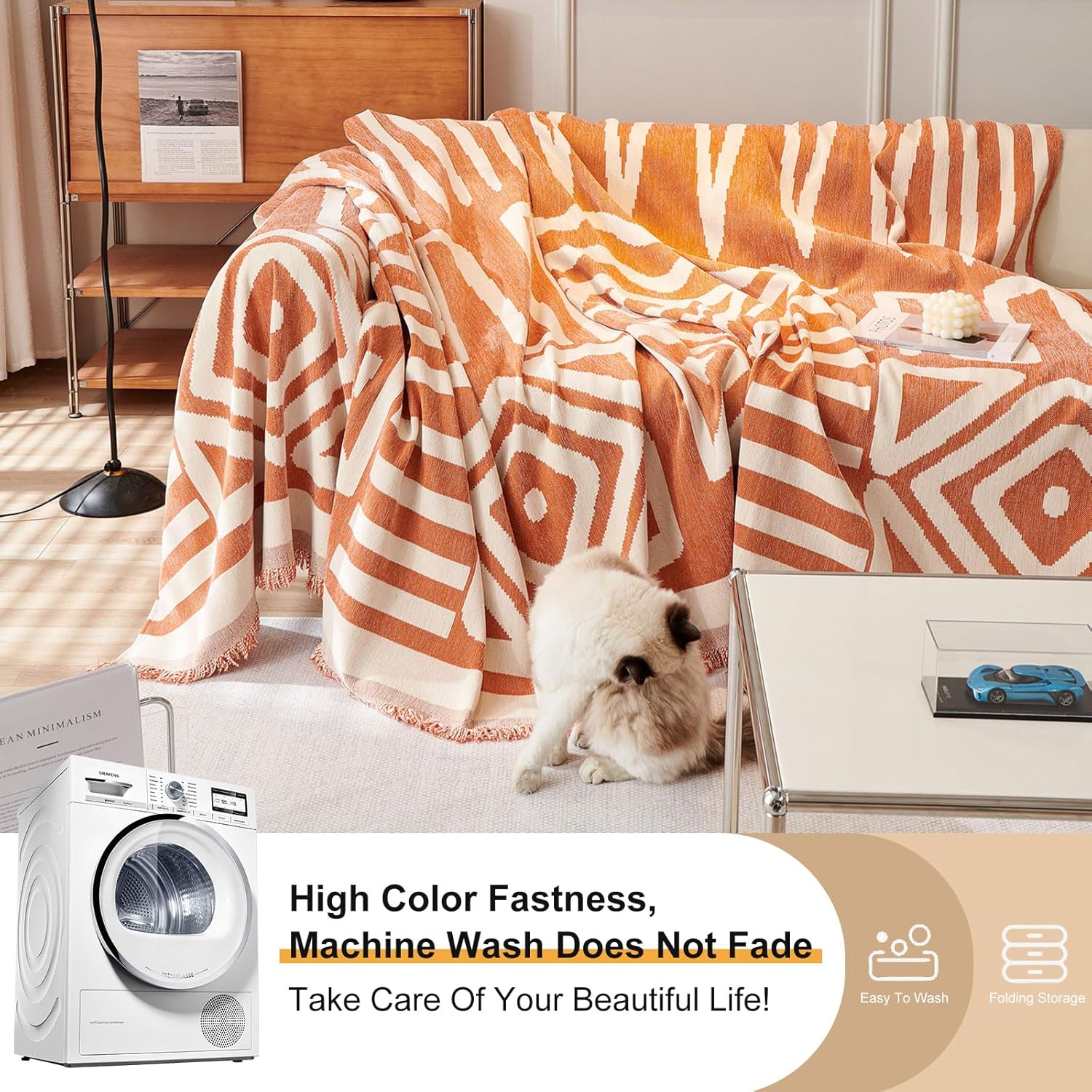 STACYPIK Geometric Orange Sofa Cover - Boho Triangle Reversible Protector for 3 Cushion Couch - Pet-Friendly, Washable Multi-Use Blanket - 91x150IN
