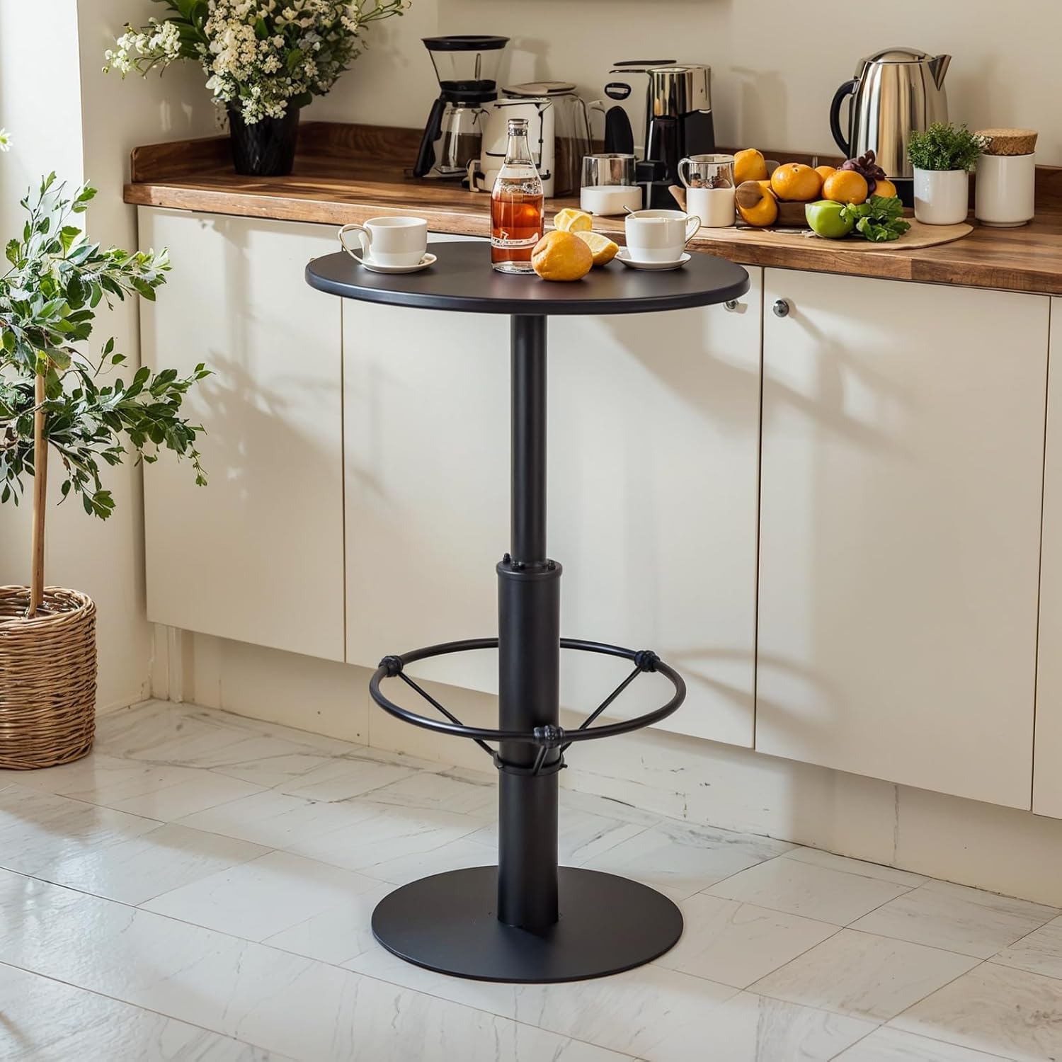 - Features a round metal top, smooth matte black iron body, and unique adjustable footrest rail,this bar table reflects the design aesthetics of industrial machinery.