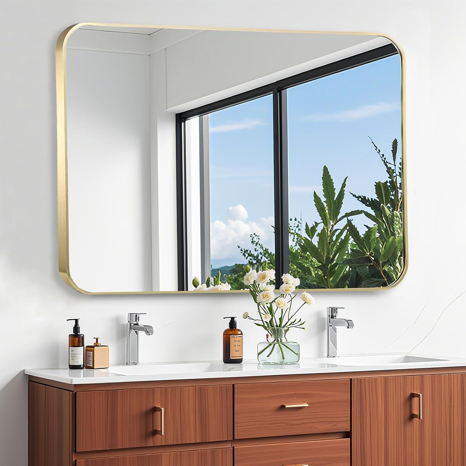 40x30 Inch Gold Bathroom Mirror, Brushed Gold Metal Framed Rectangular Mirror with Rounded Corner, Bathroom Vanity Mirror for Bedroom or Living Room, Horizontal/Vertical