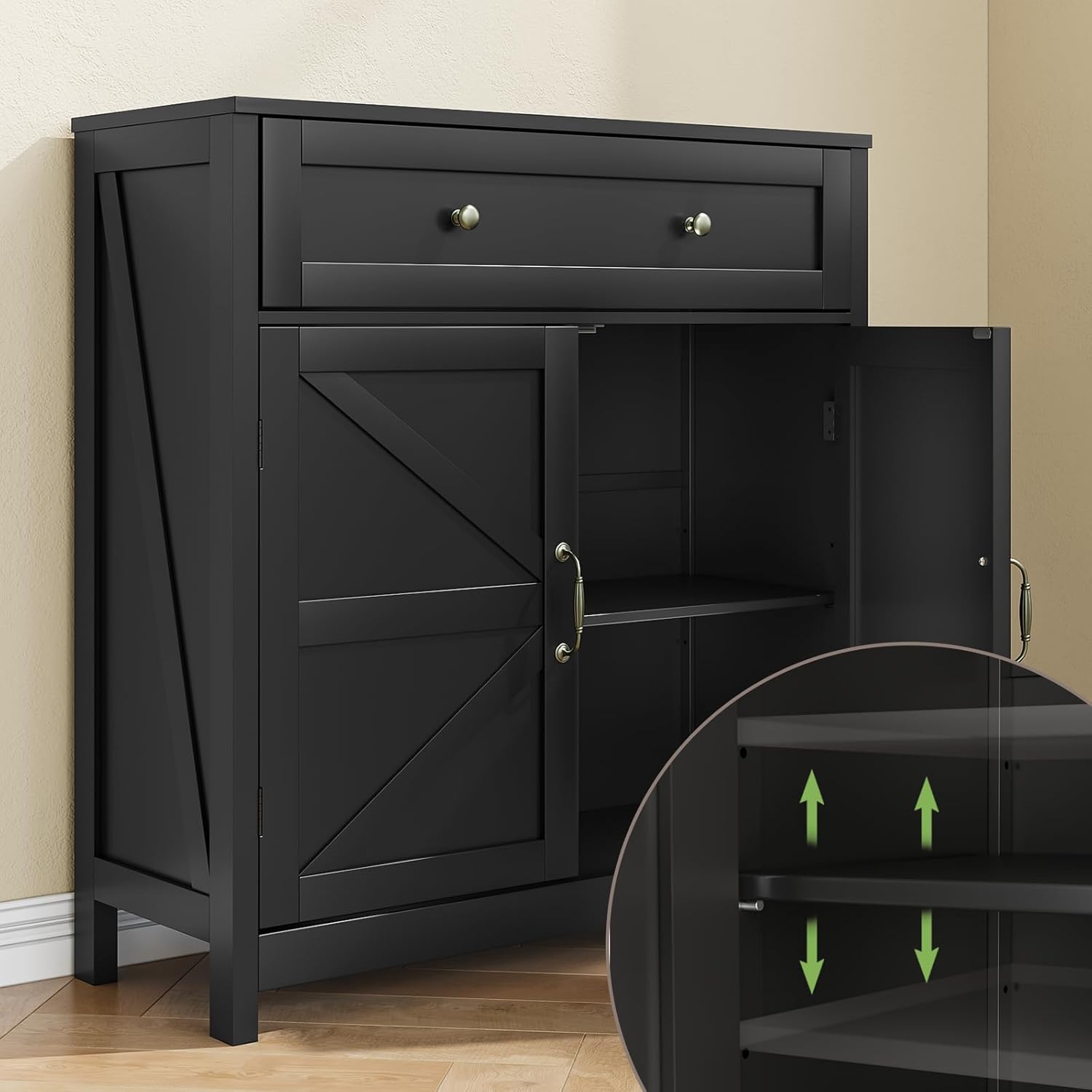 - [Plenty of Storage] Farmhouse kitchen storage cabinet made of particle board, feature a large drawer, 2 barn doors cabinet with an adjustable shelf, meet your kitchen storage for coffee beans, glass food jars, plates, bowls and some sundries, and wide tabtop would a great way to place coffee maker, toaster and mugs