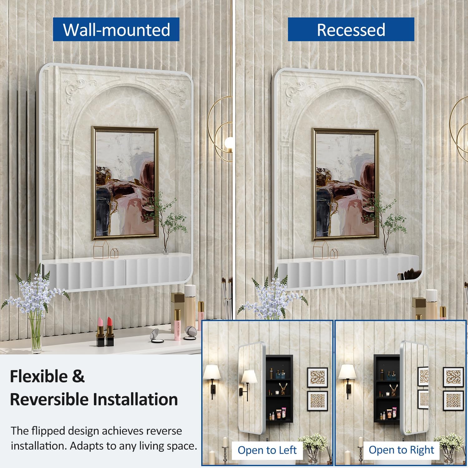 - Flexible Installation for Better Adaptability - The medicine cabinets for bathroom supports recessed and wall-mounted installation, which provides flexibility to match your bathroom layout and design. The cabinet can achieve 180° reverse installation thus adapts to any living space. (*the specific cutout size is not equal to the mirror size, please measure the cabinet size before selecting a recessed installation).