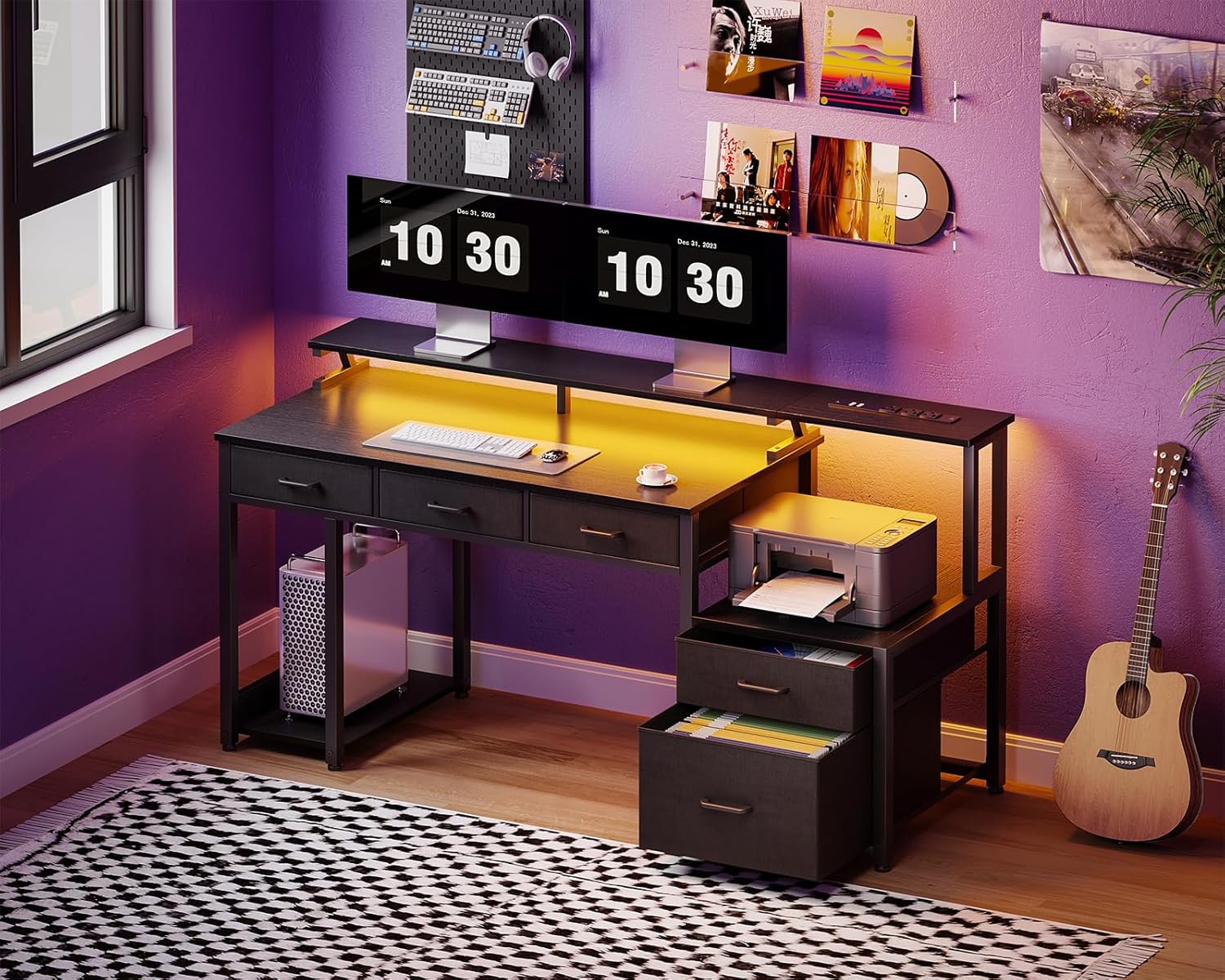 AODK 55 Inch Computer Desk with 3 Drawers and File Cabinet for Storage, Office Desk with Monitor Stand and LED Lights, Home Office Desks, Black