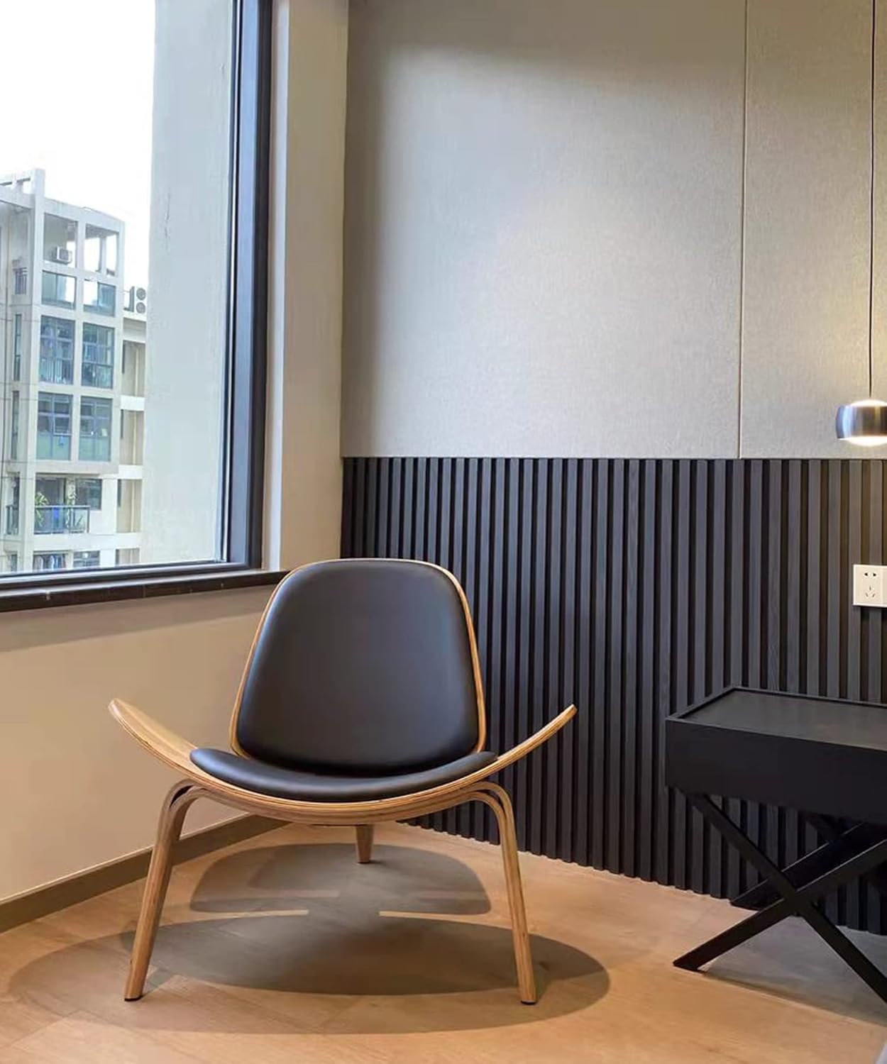 Hans Wegner Style Three- Legged Shell Chair Ash Plywood White Faux Leather Accent Chair Living Room Furniture Mid-Century Modern Shell Chair (Wood Color-Black)
