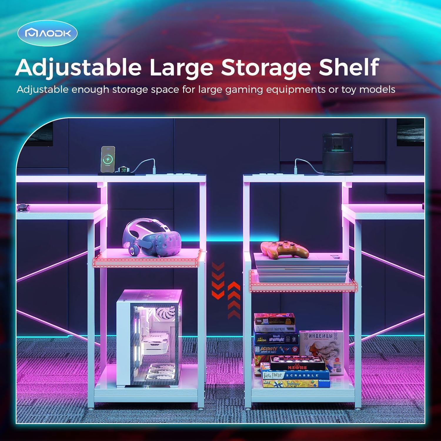 AODK Computer Desk, 48 Inch Gaming Desk with Led Lights & Power Outlet, Office Desk with Storage Shelves, Reversible Desk with Monitor Shelf & Headphone Hook, White