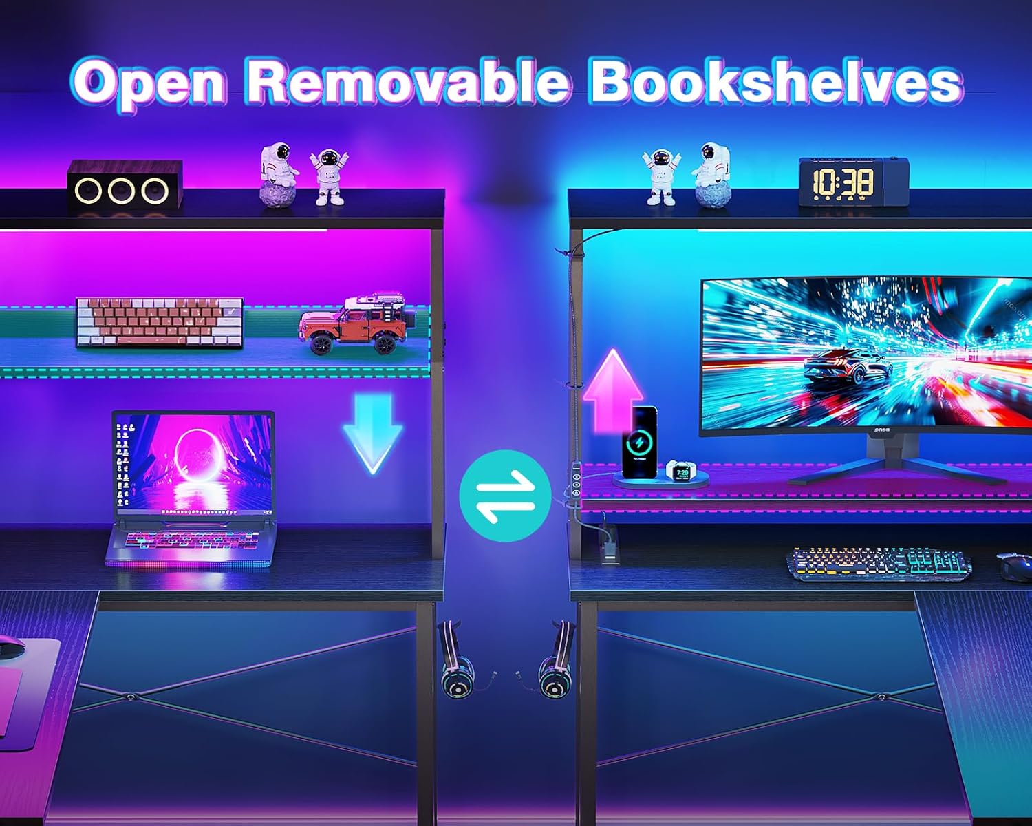 - 【AODK Reversible L Shape Desk】This L shaped gaming desk comes with storage shelves, power outlet, light strip, CPU stand, headphone hook and storage bag. The L desk is reversible and the top hutch can be fixed on the left or right side according to your display needs, maximizing your limited space and ideal for corner spaces. A great choice for home office, game, office, studio and living room.