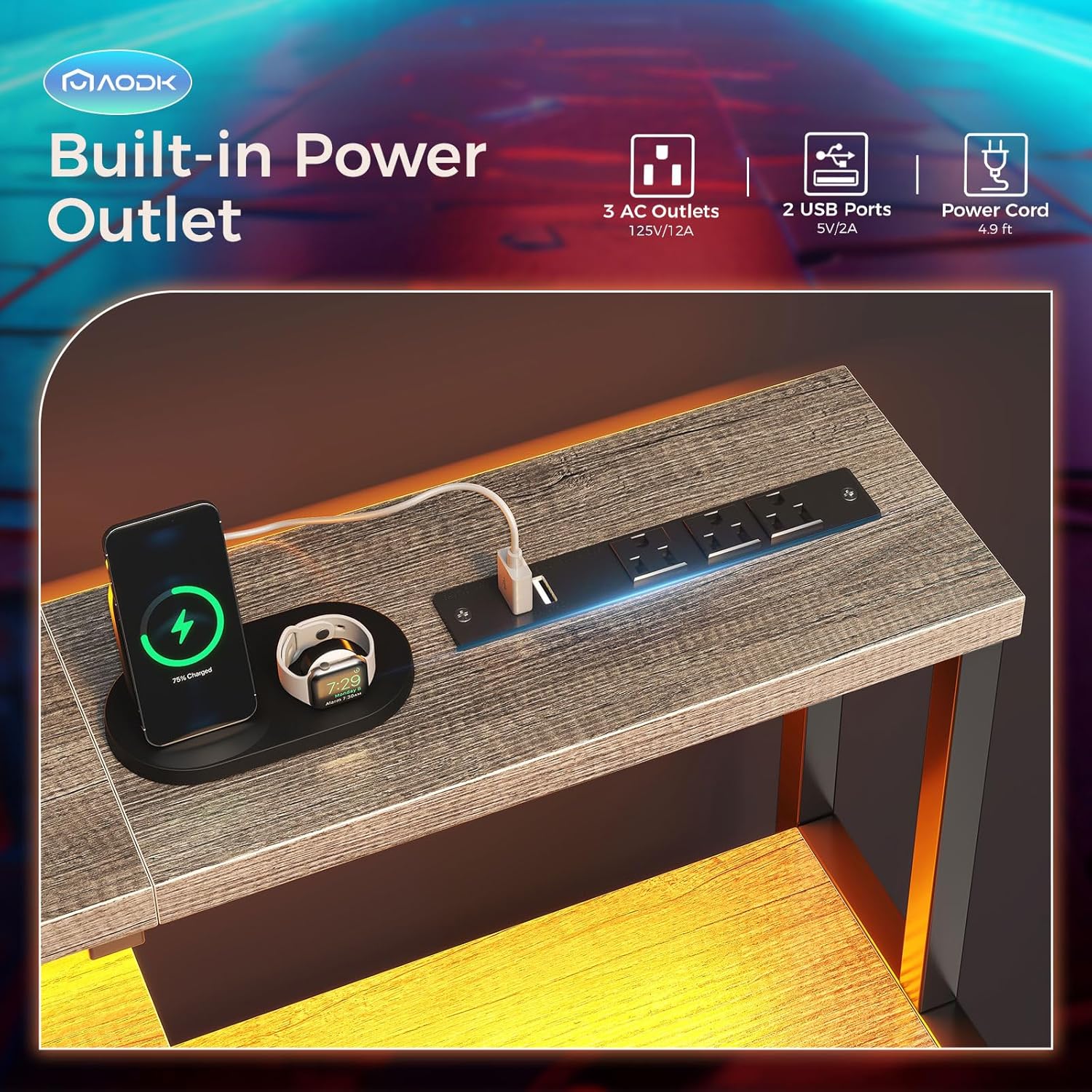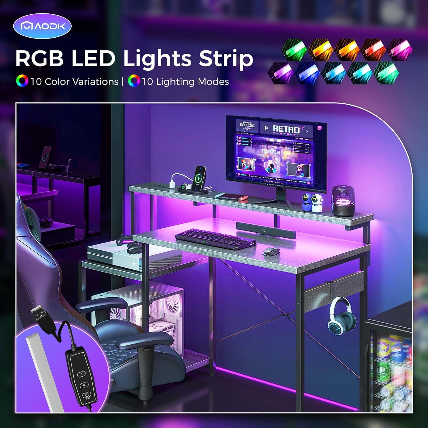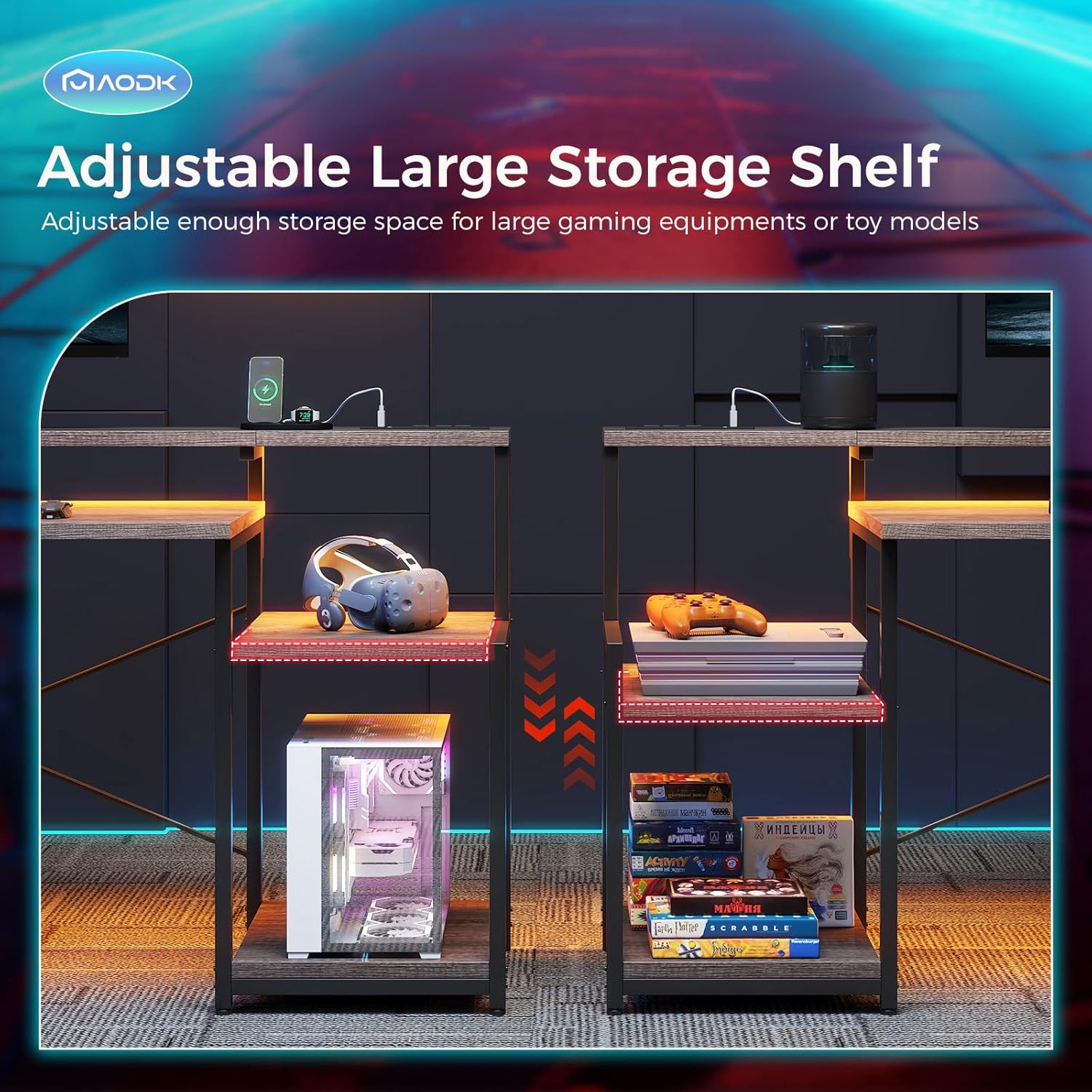 AODK Computer Desk, 48 Inch Gaming Desk with Led Lights & Power Outlet, Office Desk with Storage Shelves, Reversible Desk with Monitor Shelf & Headphone Hook, Grey Oak