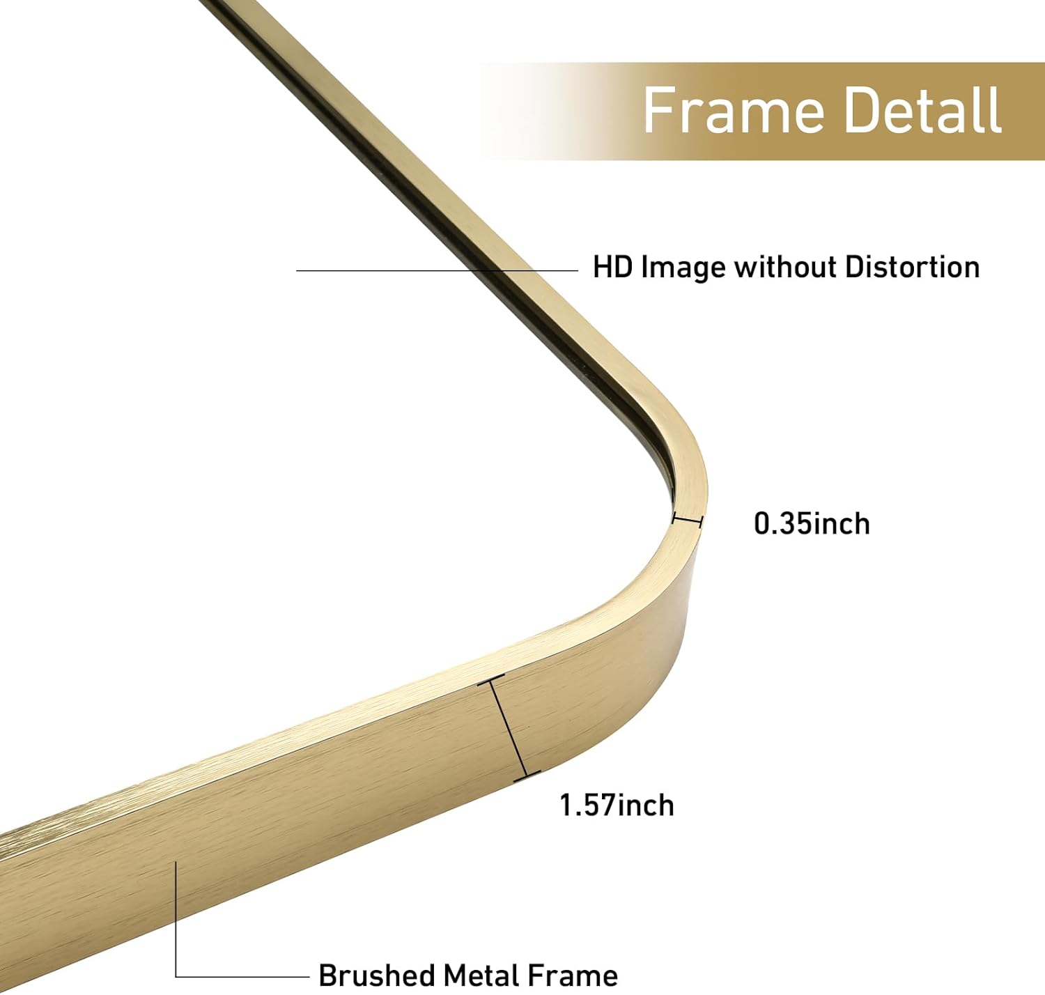 - [ALUMINUM FRAME WITH ROUNDED CORNER] Our brushed gold bathroom mirror frame is made of high quality aluminum alloy with a thickened baking varnish surface, which is sturdy and stable. The edges and corners have been hand polished many times, smooth and soft. It is both sturdy and stable without losing its elegance. The frame has corrosion-resistant properties, perfect for bathroom use.