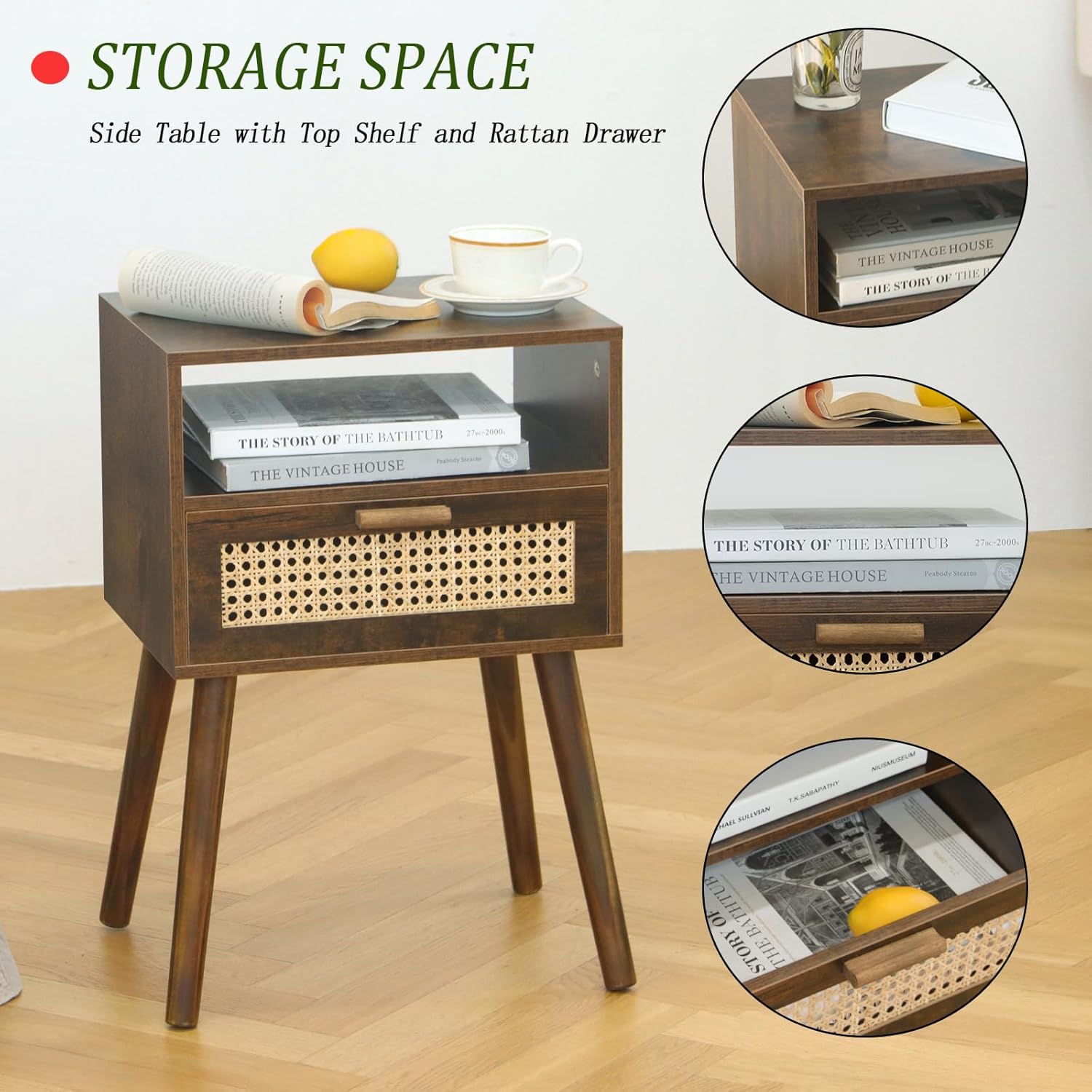 - Stylish and Practical Storage: The mid century nightstand features a two-tier storage design, a unique extra top shelf and a spacious tabletop with a natural rattan drawer to fit your snug home and provide more space to put down books, snacks, drinks