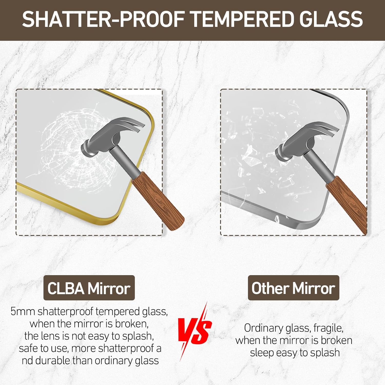 - 【Crystal Clear Reflection】The rectangular mirror uses 4-layer float technology to provide crystal clear reflection, ensuring you see every detail accurately, making it an essential tool for grooming and styling. And the brass mirror is made of 5mm tempered glass, which is shatterproof and explosion-proof to protect you and your family.