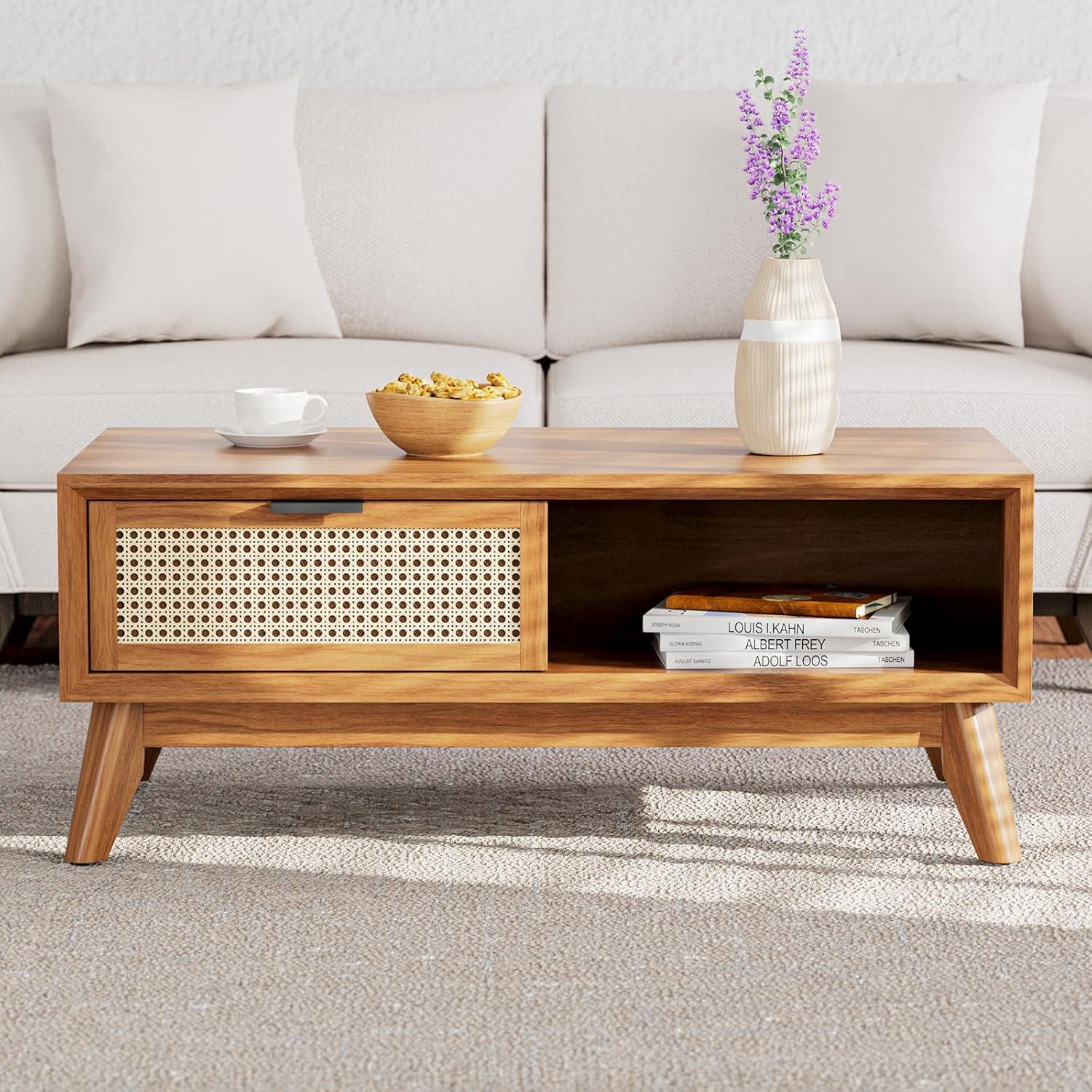 - UNDER 5 MINUTES WOOD COFFEE TABLE ASSEMBLY: The rattan coffee table comes semi assembled, including all parts, hardware, and instructions; Just put on the legs, and your coffee table with drawers is ready
