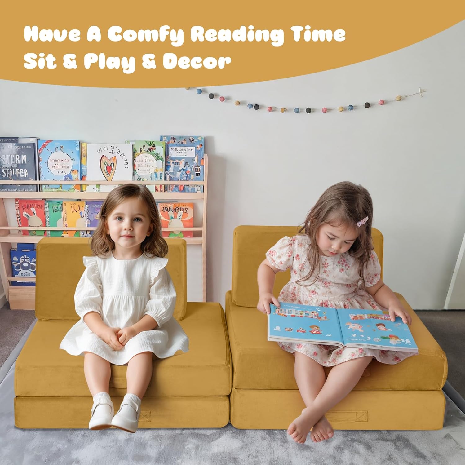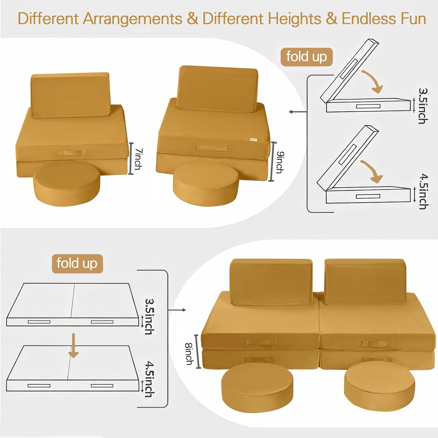 MeMoreCool Modular Kids Couch Sofa, Mustard 8-Piece Convertible Foam Play Couch Set for Toddlers and Playroom