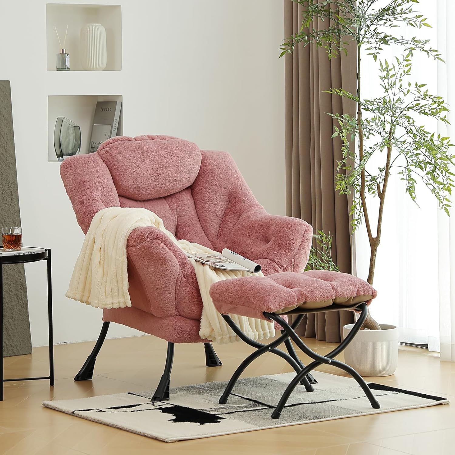 Lazy Chair with Ottoman, Modern Chair with Folding Footrest, Lounge Accent Chair, Comfortable Reading Chair (Plush Dark Pink)