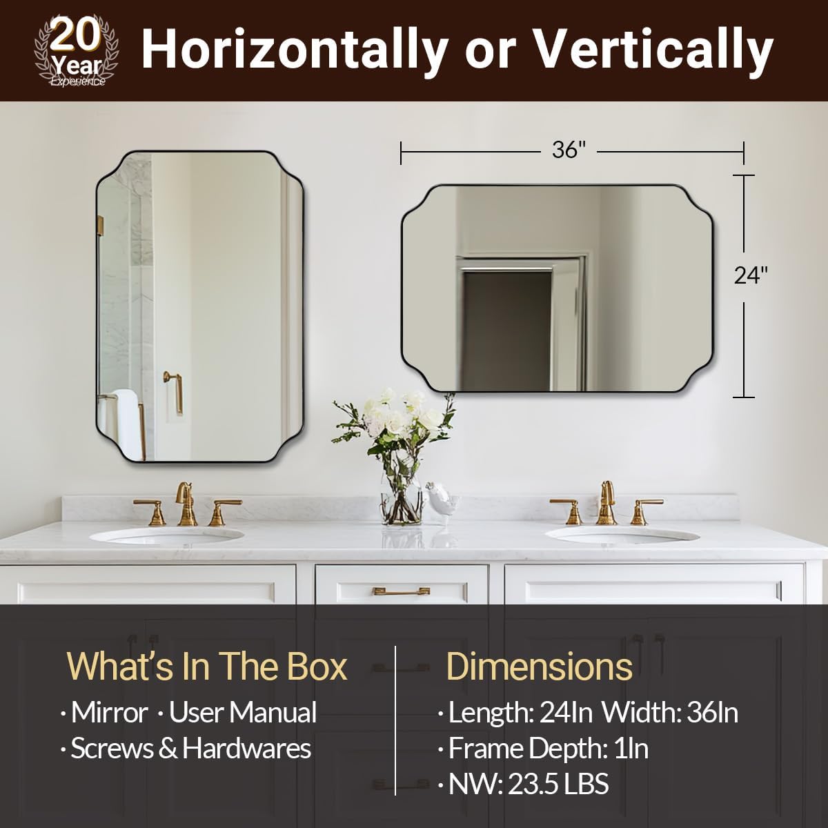 - 【Easy and Secure Installation】: 4 pre-installed D-Rings, along with all necessary hardware and clear installation instructions, ensure a hassle-free setup process. For any missing hardware, simply reach out to us for prompt assistance. Due to its weight, we recommend having 2 people install this heavy bathroom vanity mirror