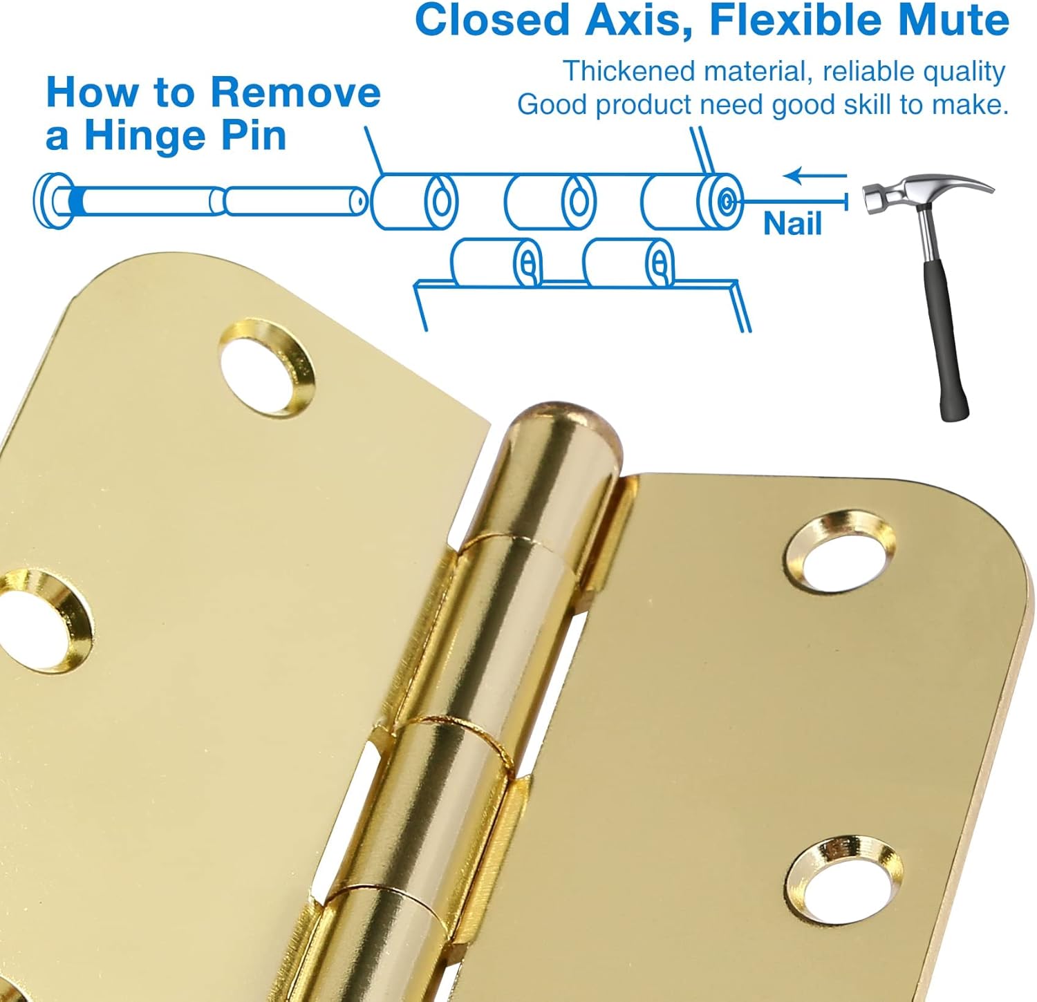 6 Pack Rounded Door Hinges 3.5 inch X 3-1/2" 5/8 Radius, Polished Brass 3 ½ Inch Gold Interior Standard Hinge for Bedroom Wood/French Style Clear Glass Doors Easy Install Hardware Decor Accessories