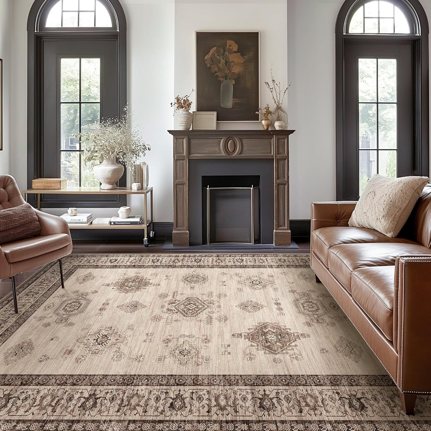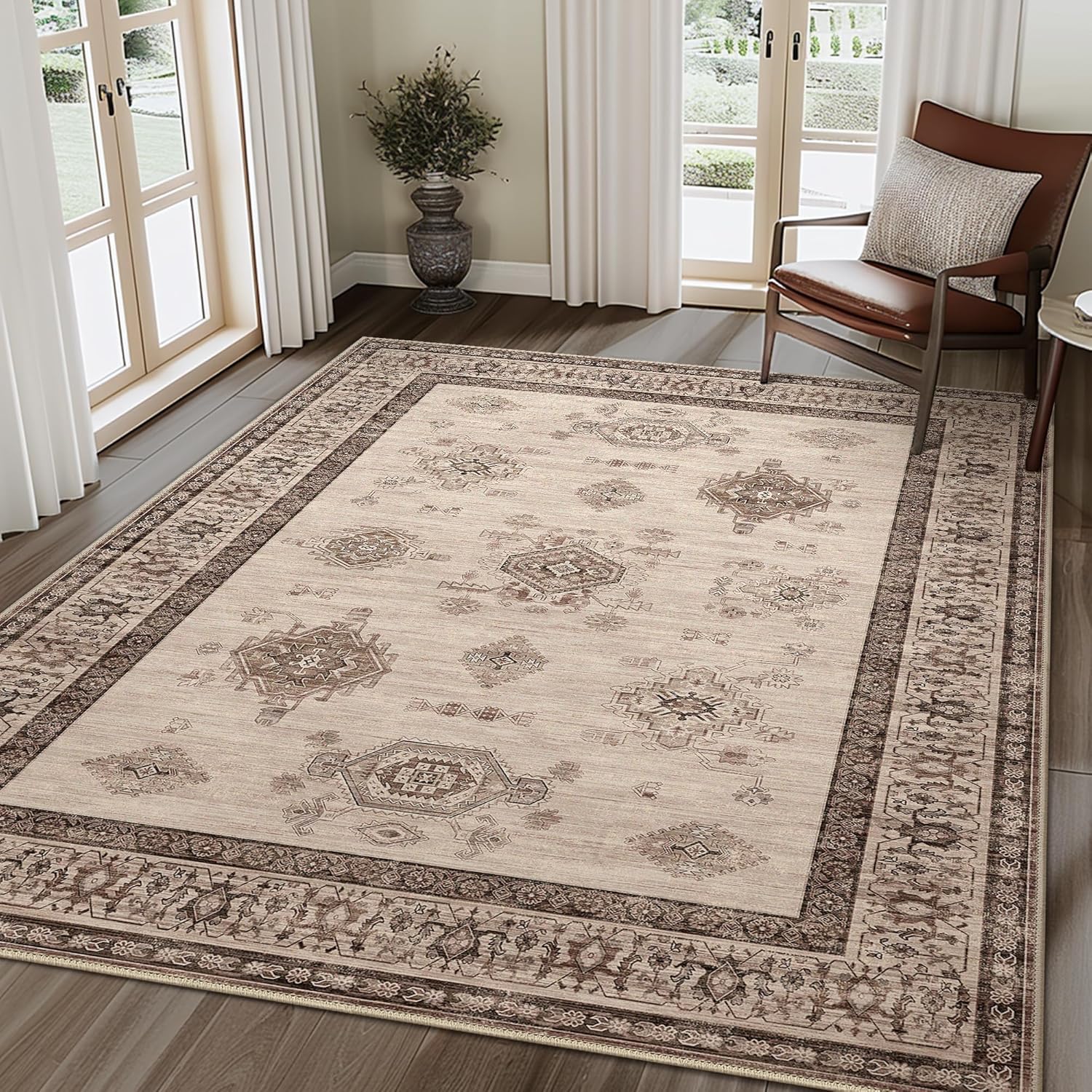 8X10 Area Rugs Machine Washable Rugs for Living Room, Vintage Boho Large Rugs for Bedroom Dining Room, Non Slip Indoor Soft Distressed Lightweight Thin Low Pile Carpet, Beige