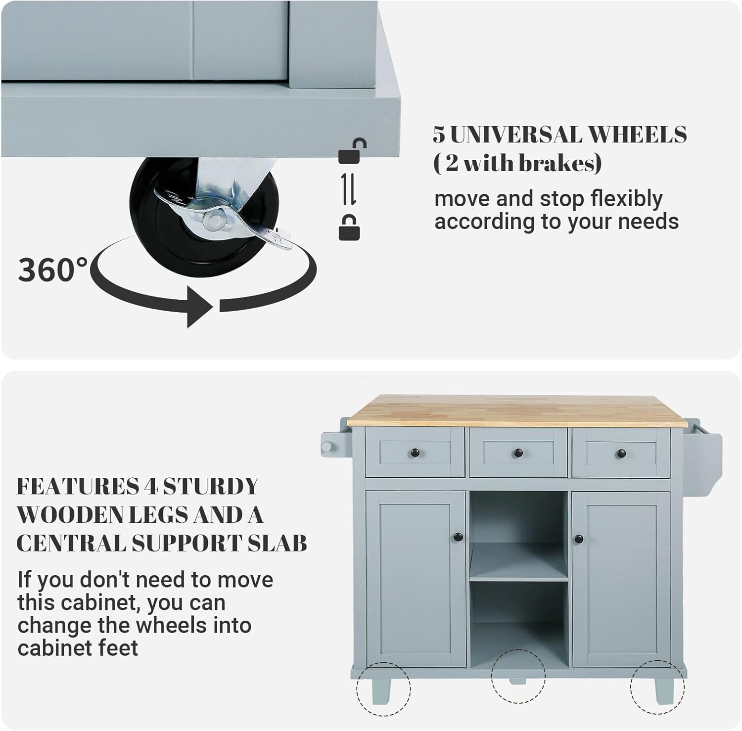 Rovibek Kitchen Island with Drawers 53 in Rolling Island Cart Mobile Portable Islands on Wheels Solid Wood Island with Storage Cabinet & Drawers, Blue