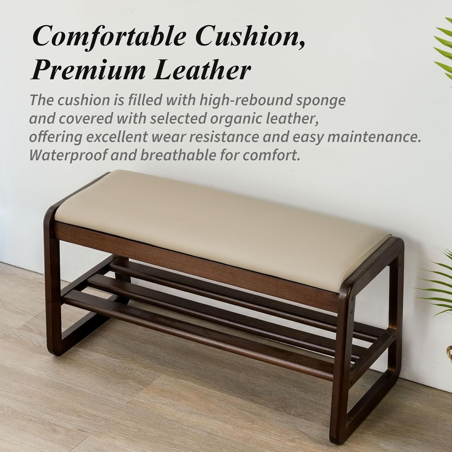 Shoe Bench, Entryway Bench with Leather Cushion, Solid Wood Shoe Rack, Mid Century Modern Bench, Shoe Storage, Shoe Organizer for Entryway (Grey, 31.5" W)