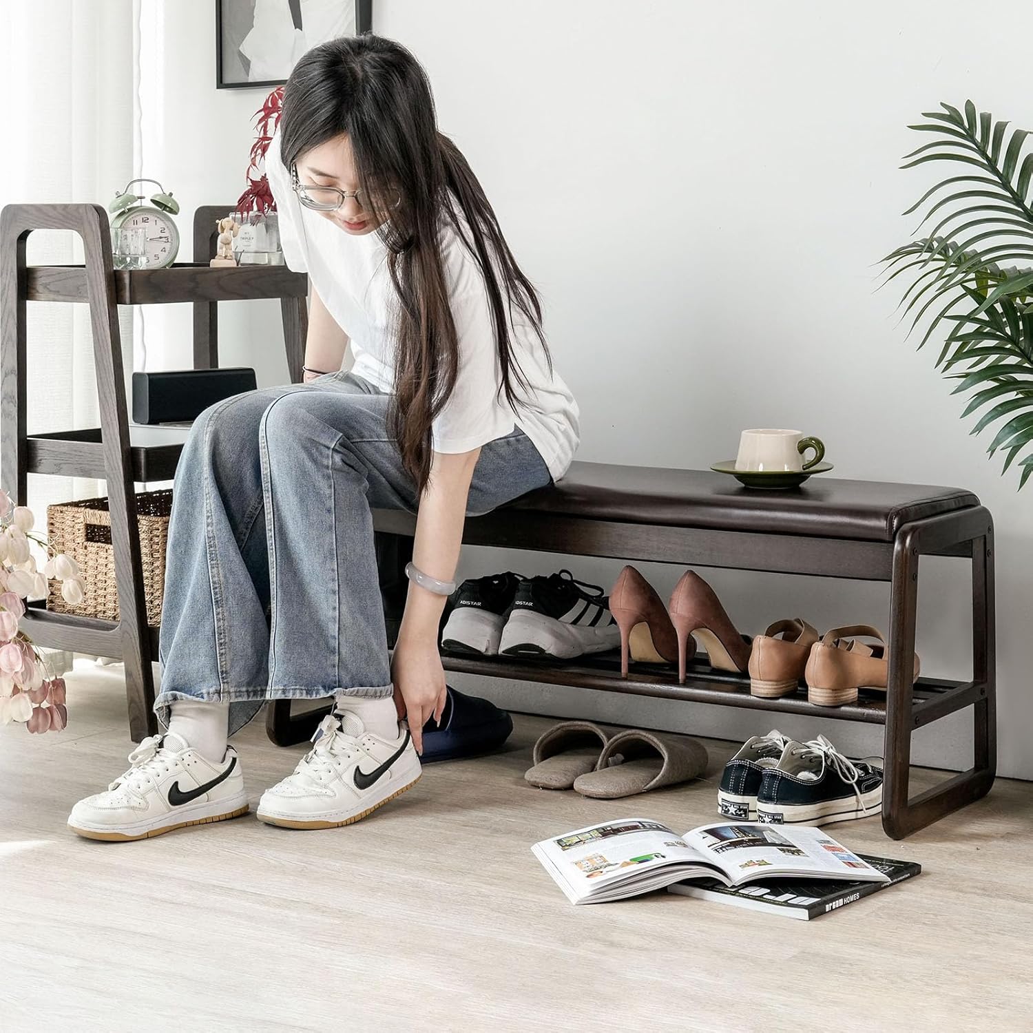 Shoe Bench, Entryway Bench with Leather Cushion, Solid Wood Shoe Rack, Mid Century Modern Bench, Shoe Storage, Shoe Organizer for Entryway (Brown, 39.4" W)