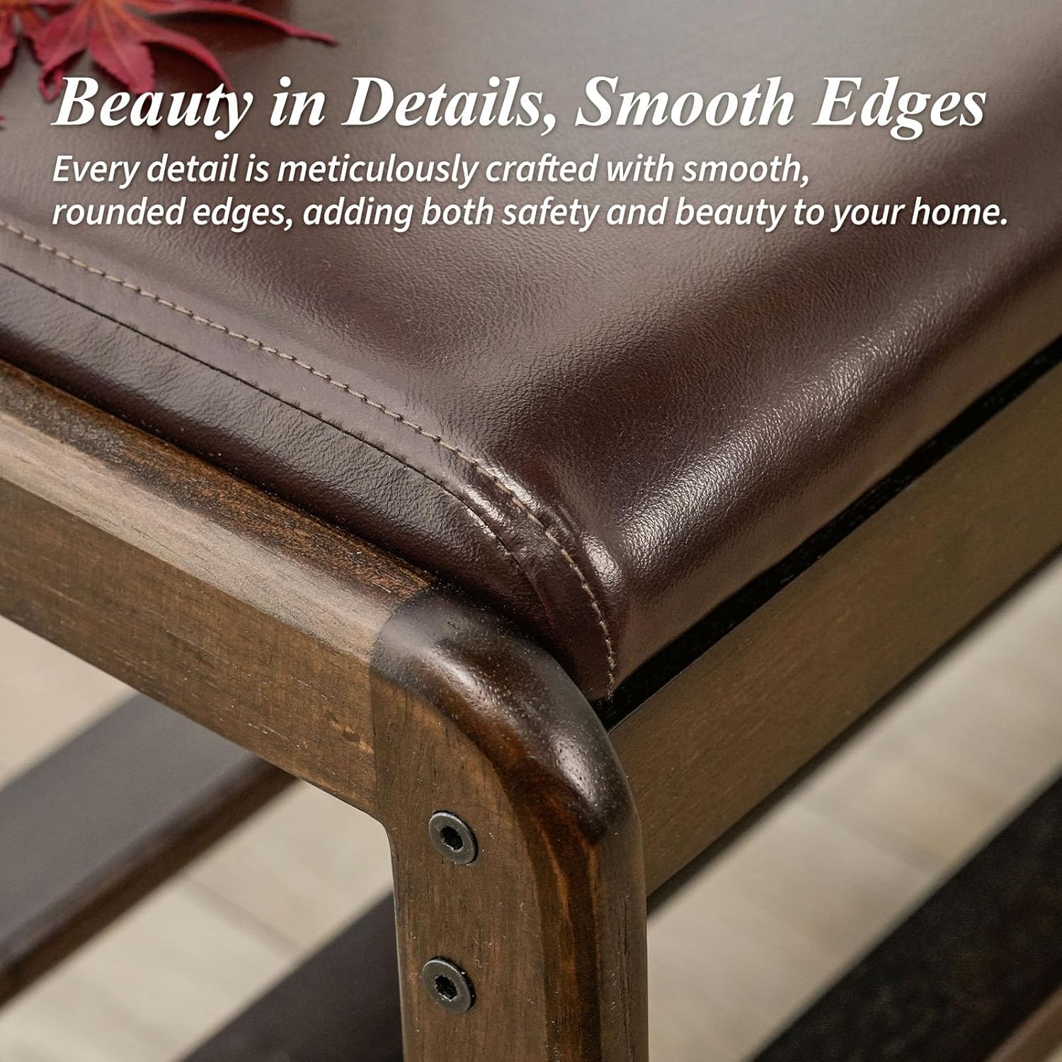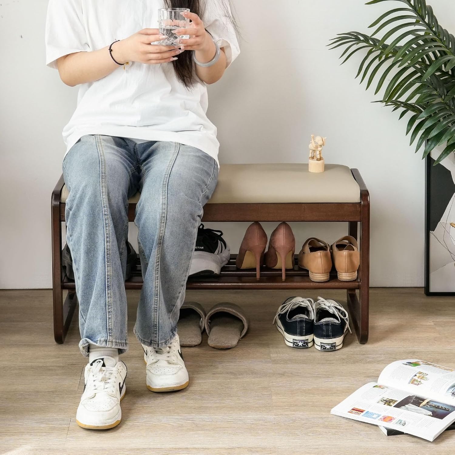 Shoe Bench, Entryway Bench with Leather Cushion, Solid Wood Shoe Rack, Mid Century Modern Bench, Shoe Storage, Shoe Organizer for Entryway (Brown, 31.5" W)