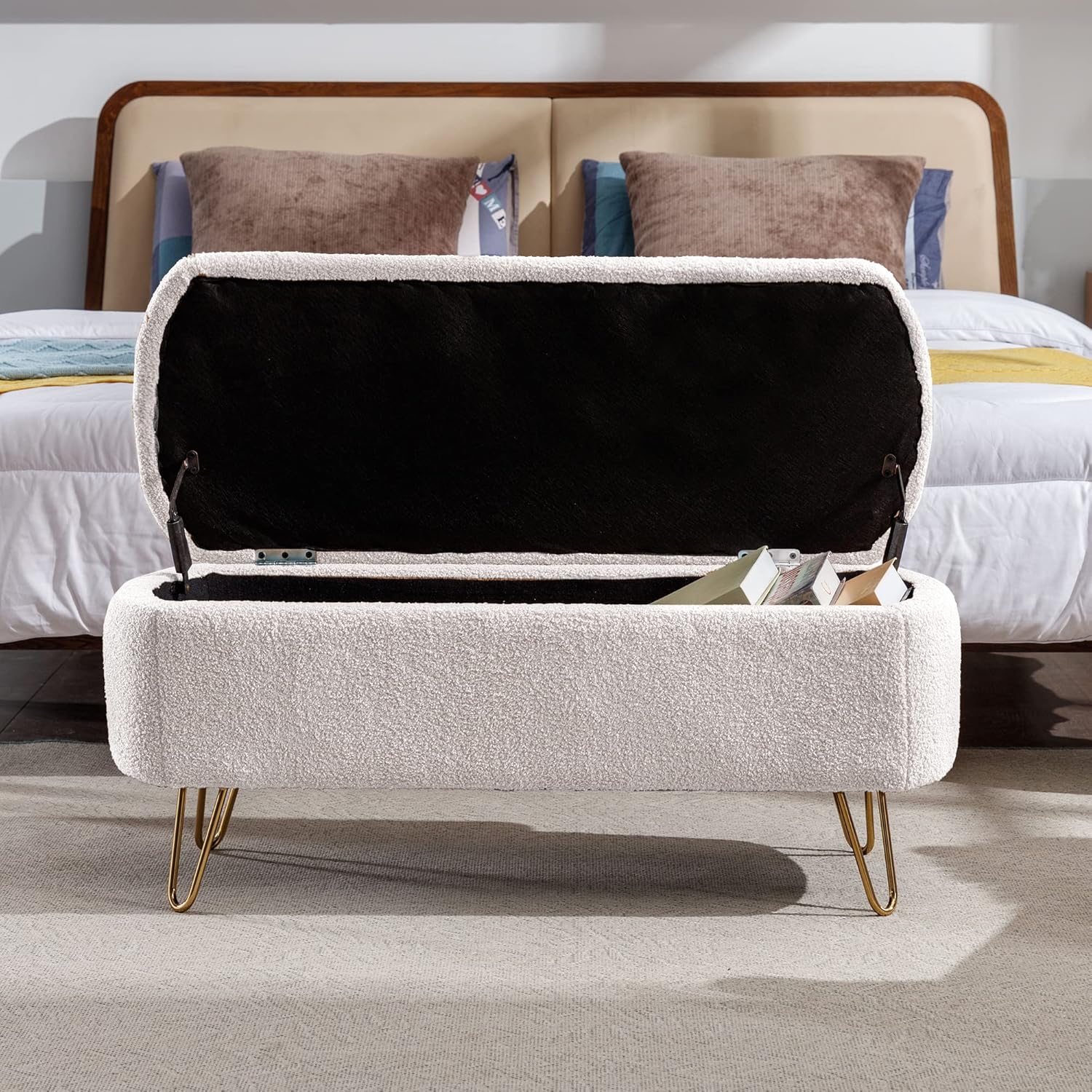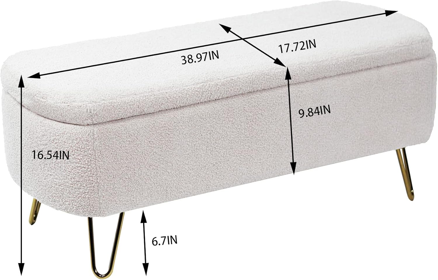 Storage Ottoman for End of Bed with Gold Legs, Modern Faux Fur Entryway Bench,for Living Room,Bedroom,End of Bed,Ivory White