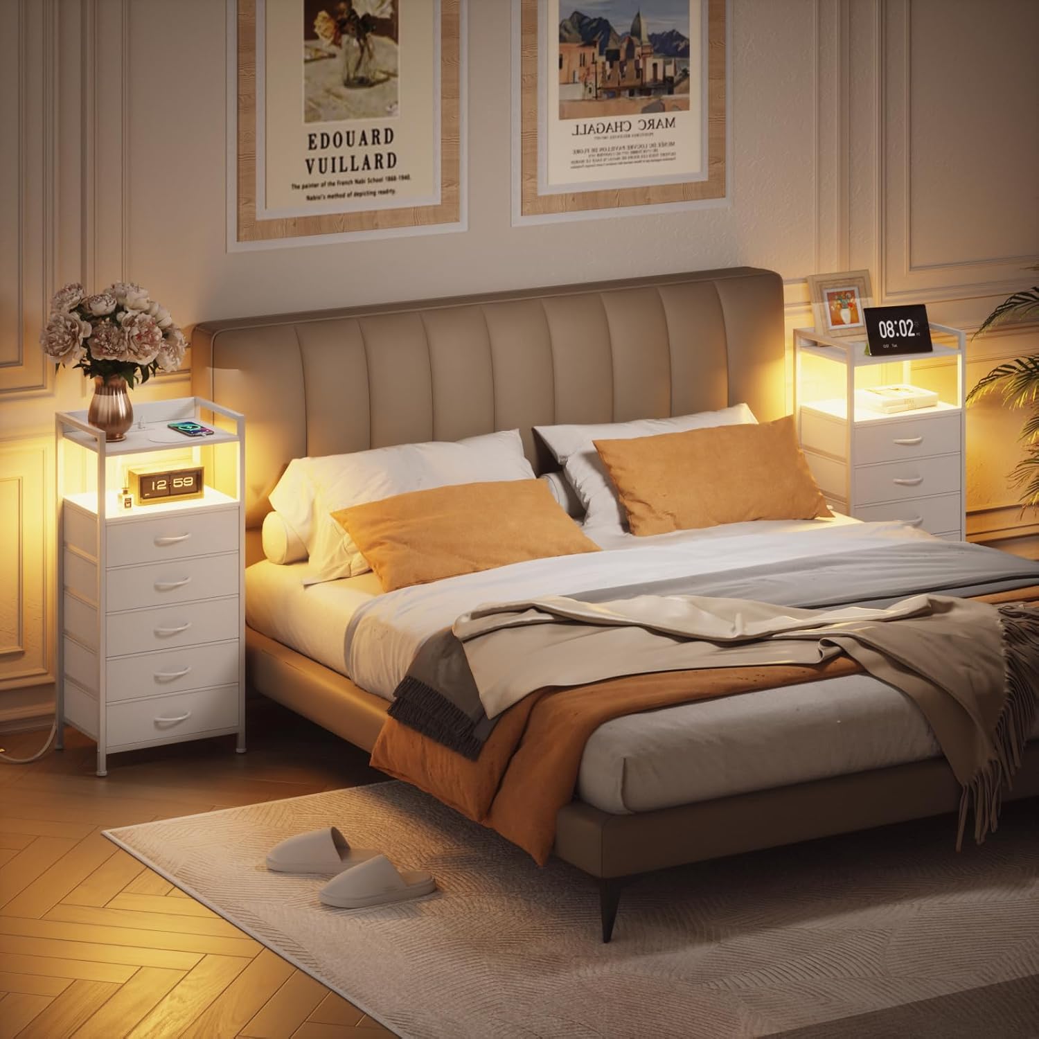 Furnulem White Nightstand with 5 Storage Drawer, Tall Dresser for Bedroom with Led Light and Charging Station, Side Table Nightstand for Closet, Fabric Bins, Metal Frame, Wood Shelf(White)