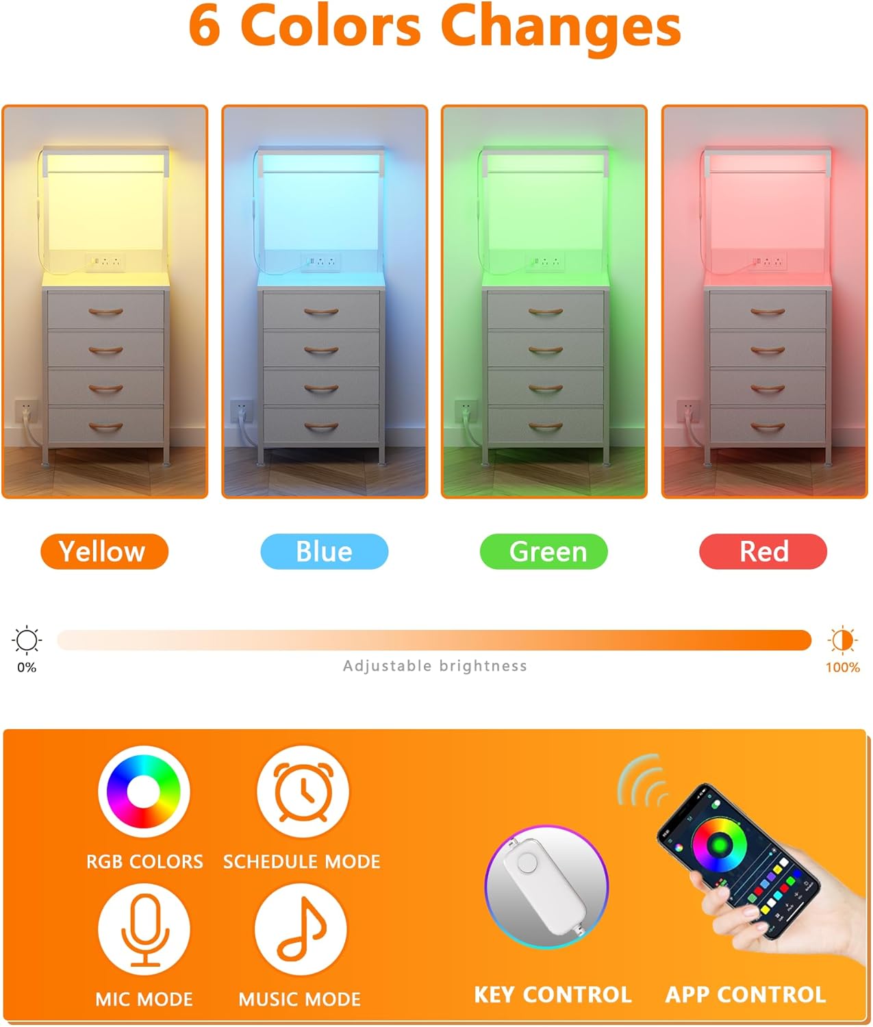 - 【4 Drawers Night Stand with LED Lights】 6 RGB LED colors, adjustable brightness, three modes, push-button control or cell phone control, whether it's warm lighting or fashionable colors, you can adjust it to make your life more colorful and vibrant.