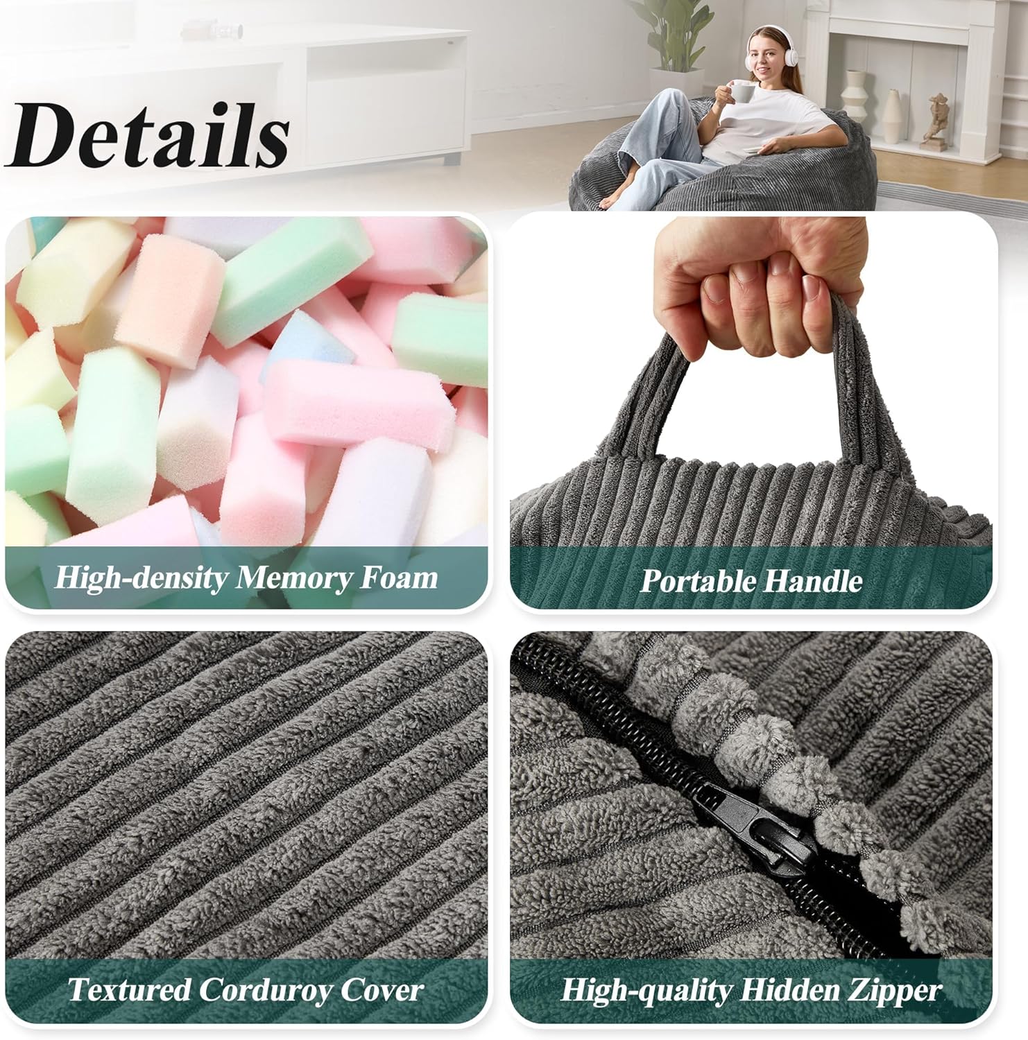 - COMFORTABLE & DURABLE FABRIC: Our bean bag chairs are made of textured corduroy, which is skin-friendly. The cover can be machine washable so that you can clean it like new. The filled memory foam is high-density, which is easily rebound and make you feel relaxed once you lie down or sit on the chairs.