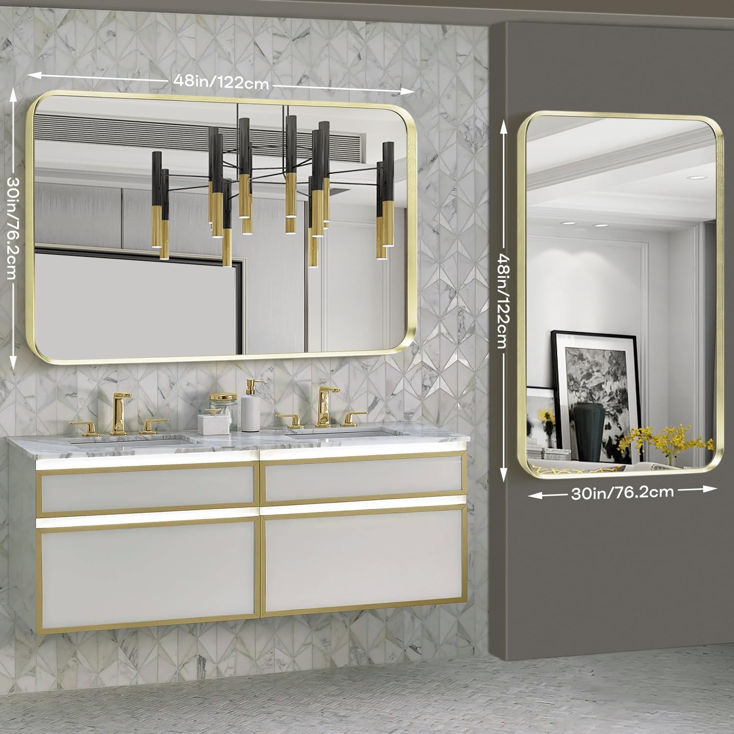 Large Gold Bathroom Mirror, Rounded Corner Rectangular Brushed Gold Frame Vanity Mirror, Wall-Mounted, Anti-Rust, Tempered Glass, Hangs Horizontally or Vertically (30" x 48", Gold)